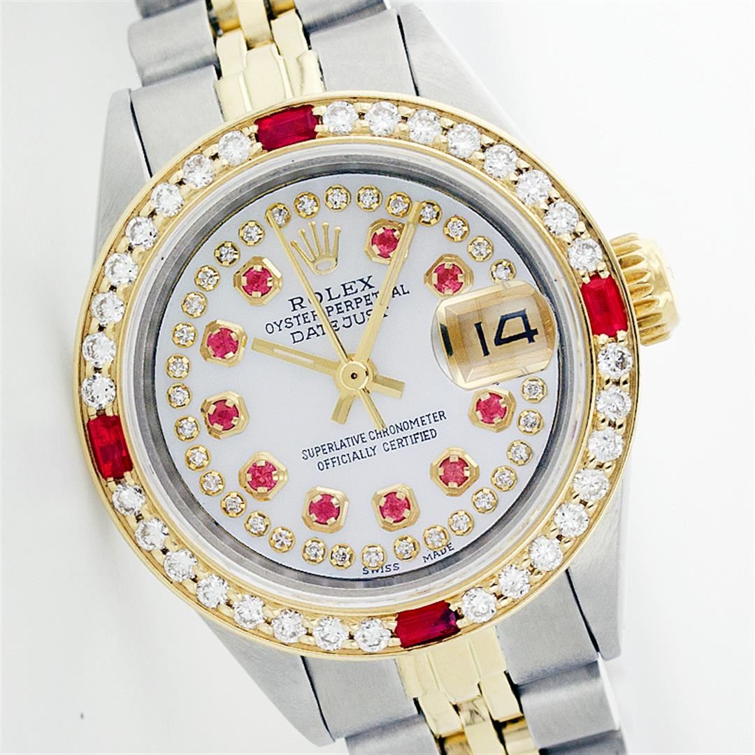 One Ladies Two Tone Rolex Datejust Polished, Serviced & Electronically Tested, 14K Yellow Gold & Stainless Steel Case:26mm, 14K Yellow Gold Crown, Custom Bezel: 18K Yellow Gold Ruby Beadset Diamond Bezel, Diamond Count: 28 Diamonds + 4 Rubies Total Weight .70 Carat, Clarity: Si-VS, Color: G to H. Custom Crystal: Synthetic Sapphire Cyclops Lens. Movement: Automatic Winding Movement Caliber 2030. Custom Dial: Mother Of Pearl Ruby String Diamond Hour Markers. 10 Rubies In Dial + 33 Diamonds, Clarity: Si-VS, Color: G to H. Date Window: 3 O'Clock Position Date Display, Non Quickset, Model: 6917 Condition: G-6 Extra Fine. Bracelet: Two Tone 14K Yellow Gold & Stainless Steel Jubilee. Bright Polish. 5.5 Inch Length, Adjustable. Standard Clasp, With Rolex Logo.