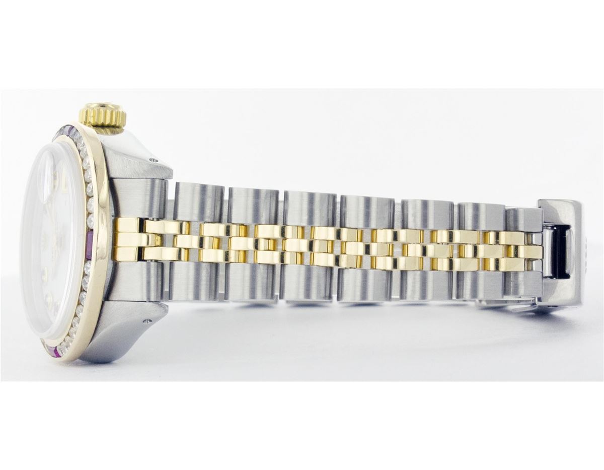One Ladies Two Tone Rolex Datejust Polished, Serviced & Electronically Tested, 14K Yellow Gold & Stainless Steel Case:26mm, 14K Yellow Gold Crown, Custom Bezel: 18K Yellow Gold Ruby Channel Set Diamond Bezel, Diamond + Gem Count: 36 Diamonds + 4 Rubies Total Weight 1.00 Carat, Clarity: Si-VS, Color: G to H. Custom Crystal: Synthetic Sapphire Cyclops Lens. Movement: Automatic Winding Movement Caliber 2030. Custom Dial: Mother Of Pearl with Ruby Hour Markers, 10 Rubies. Date Window: 3 O'Clock Position Date Display, Non Quickset, Model: 6917 Condition: G-6 Extra Fine. Bracelet: Two Tone 14K Yellow Gold & Stainless Steel Jubilee. Bright Polish. 5.5 Inch Length, Adjustable. Standard Clasp, With Rolex Logo.