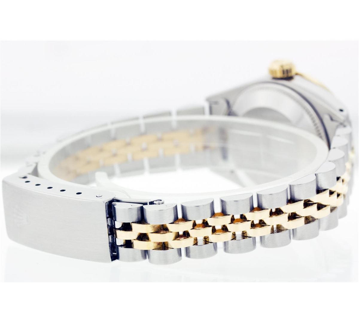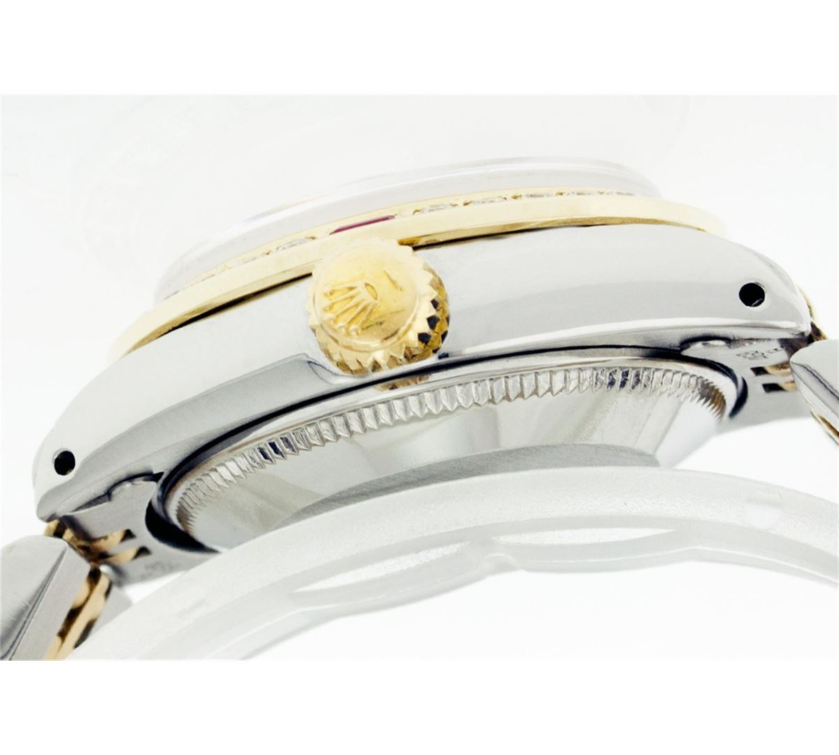 One Ladies Two Tone Rolex Datejust Polished, Serviced & Electronically Tested, 14K Yellow Gold & Stainless Steel Case: 26mm, 14K Yellow Gold Crown, Custom Bezel: 18K Yellow Gold Ruby Beadset Diamond Bezel, Diamond Count: 28 Diamonds + 4 Rubies Total Weight .70 Carat, Clarity: Si-VS, Color: G to H. Custom Crystal: Synthetic Sapphire Cyclops Lens. Movement: Automatic Winding Movement Caliber 2030. Custom Dial: Pink Mother Of Pearl Dial Set With Roman Hour Markers. Date Window: 3 O'Clock Position Date Display, Non Quickset, Model: 6917 Condition: G-6 Extra Fine. Bracelet: Two Tone 14K Yellow Gold & Stainless Steel Jubilee. Bright Polish. 5.5 Inch Length, Adjustable. Standard Clasp, With Rolex Logo.