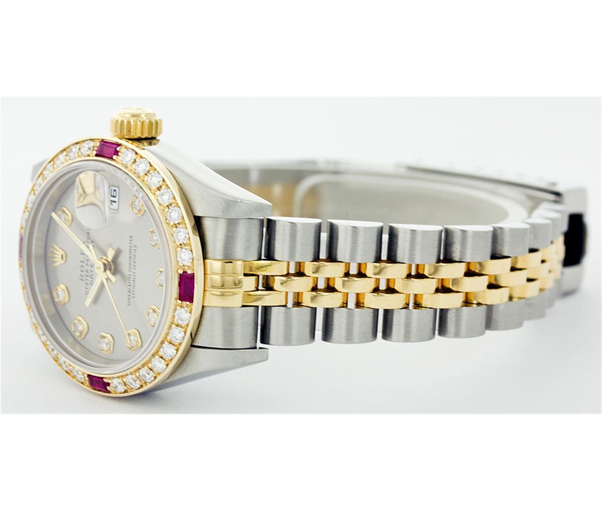 One Ladies Two Tone Rolex Datejust Polished, Serviced & Electronically Tested, 14K Yellow Gold & Stainless Steel Case:26mm, 14K Yellow Gold Crown, Custom Bezel: 18K Yellow Gold Ruby Beadset Diamond Bezel, Diamond Count: 28 Diamonds + 4 Rubies Total Weight .70 Carat, Clarity: Si-VS, Color: G to H. Custom Crystal: Synthetic Sapphire Cyclops Lens. Movement: Automatic Winding Movement Caliber 2030. Custom Dial: Silver With Diamond Hour Markers. 10 Diamonds In Dial, Clarity: Si-VS, Color: G to H. Date Window: 3 O'Clock Position Date Display, Non Quickset, Model: 6917 Condition: G-6 Extra Fine. Bracelet: Two Tone 14K Yellow Gold & Stainless Steel Jubilee. Bright Polish. 5.5 Inch Length, Adjustable. Standard Clasp, With Rolex Logo.