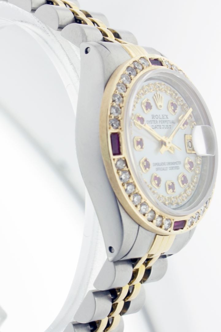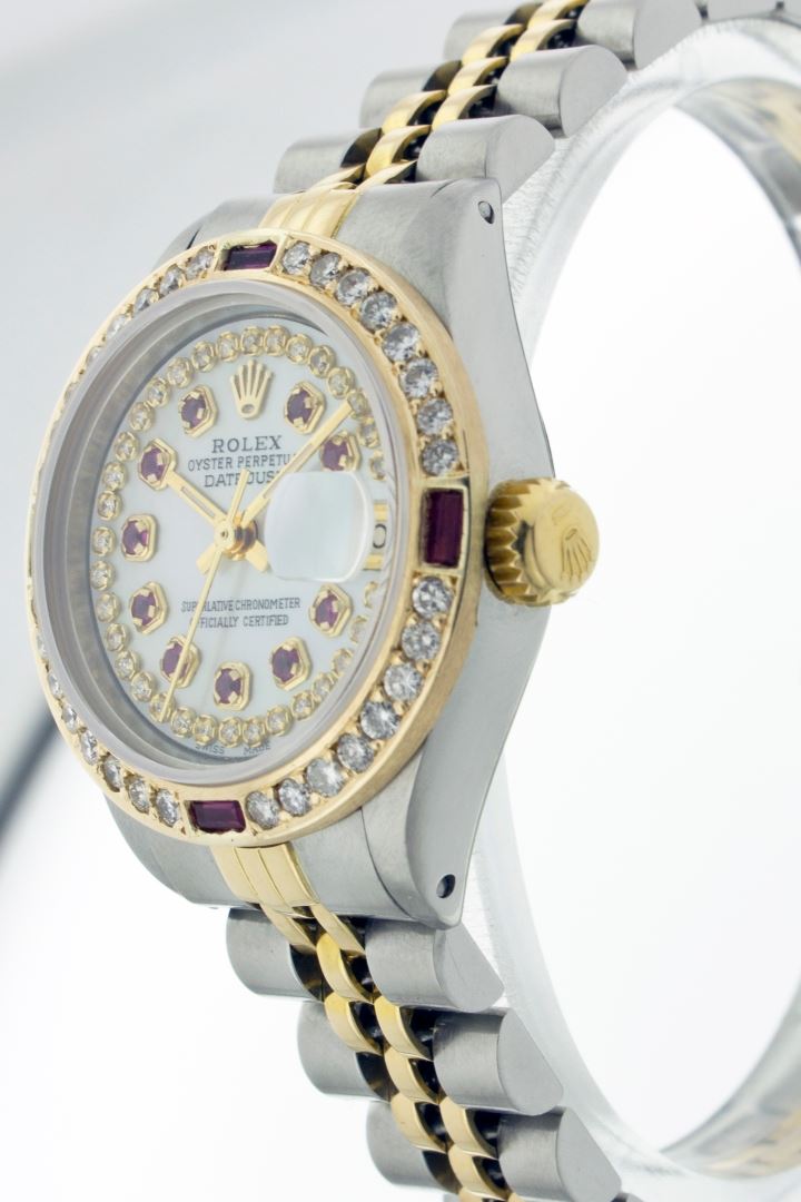 One Ladies Two Tone Rolex Datejust Polished, Serviced & Electronically Tested, 14K Yellow Gold & Stainless Steel Case:26mm, 14K Yellow Gold Crown, Custom Bezel: 18K Yellow Gold Ruby Beadset Diamond Bezel, Diamond Count: 28 Diamonds + 4 Rubies Total Weight .70 Carat, Clarity: Si-VS, Color: G to H. Custom Crystal: Synthetic Sapphire Cyclops Lens. Movement: Automatic Winding Movement Caliber 2030. Custom Dial: Mother Of Pearl With Ruby String Diamond Hour Markers. 10 Rubies +33 Diamonds In Dial, Clarity: Si-VS, Color: G to H. Date Window: 3 O'Clock Position Date Display, Non Quickset, Model: 6917 Condition: G-6 Extra Fine. Bracelet: Two Tone 14K Yellow Gold & Stainless Steel Jubilee. Bright Polish. 5.5 Inch Length, Adjustable. Standard Clasp, With Rolex Logo.