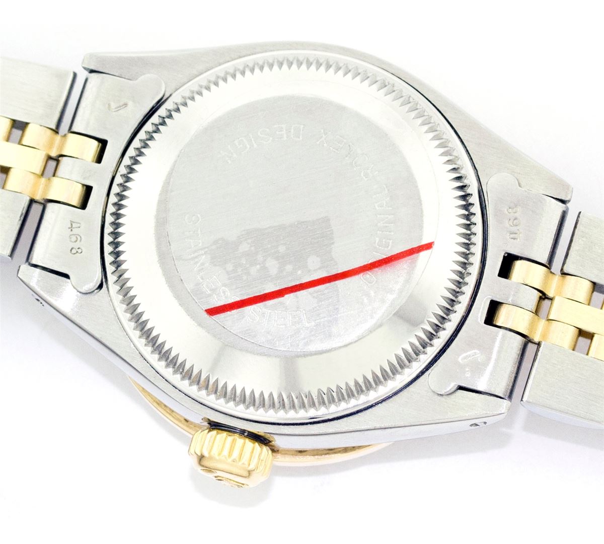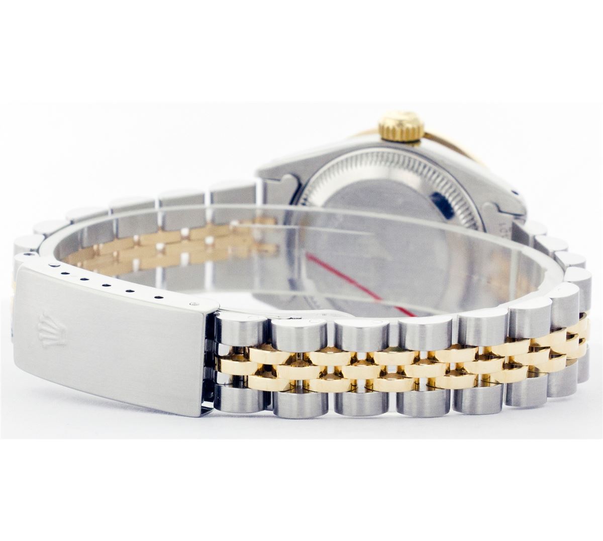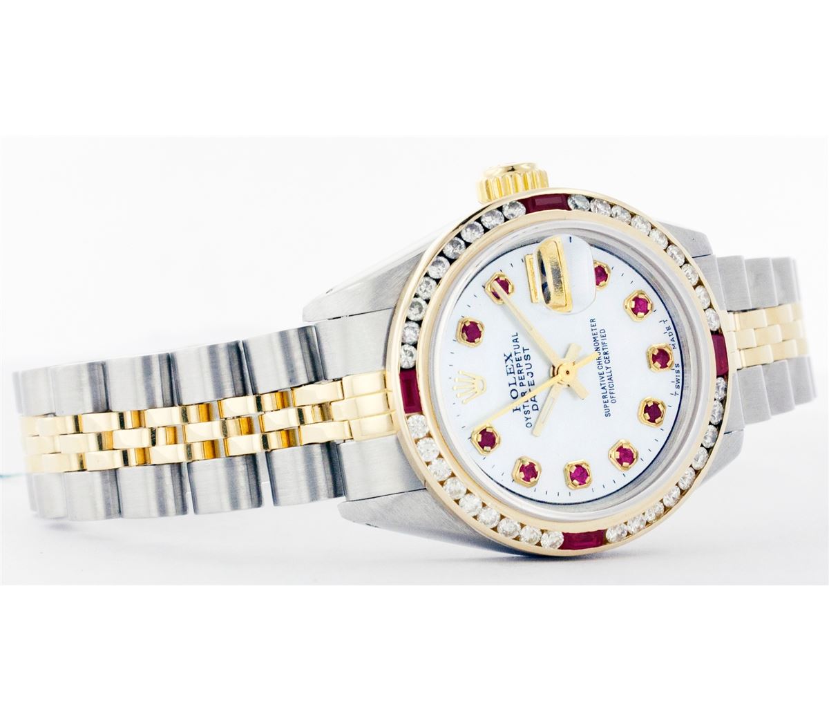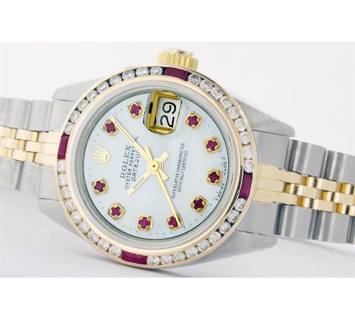 One Ladies Two Tone Rolex Datejust Polished, Serviced & Electronically Tested, 14K Yellow Gold & Stainless Steel Case:26mm, 14K Yellow Gold Crown, Custom Bezel: 18K Yellow Gold Ruby Channel Set Diamond Bezel, Diamond + Gem Count: 36 Diamonds + 4 Rubies Total Weight 1.00 Carat, Clarity: Si-VS, Color: G to H. Custom Crystal: Synthetic Sapphire Cyclops Lens. Movement: Automatic Winding Movement Caliber 2030. Custom Dial: Mother Of Pearl with Ruby Hour Markers, 10 Rubies. Date Window: 3 O'Clock Position Date Display, Non Quickset, Model: 6917 Condition: G-6 Extra Fine. Bracelet: Two Tone 14K Yellow Gold & Stainless Steel Jubilee. Bright Polish. 5.5 Inch Length, Adjustable. Standard Clasp, With Rolex Logo.