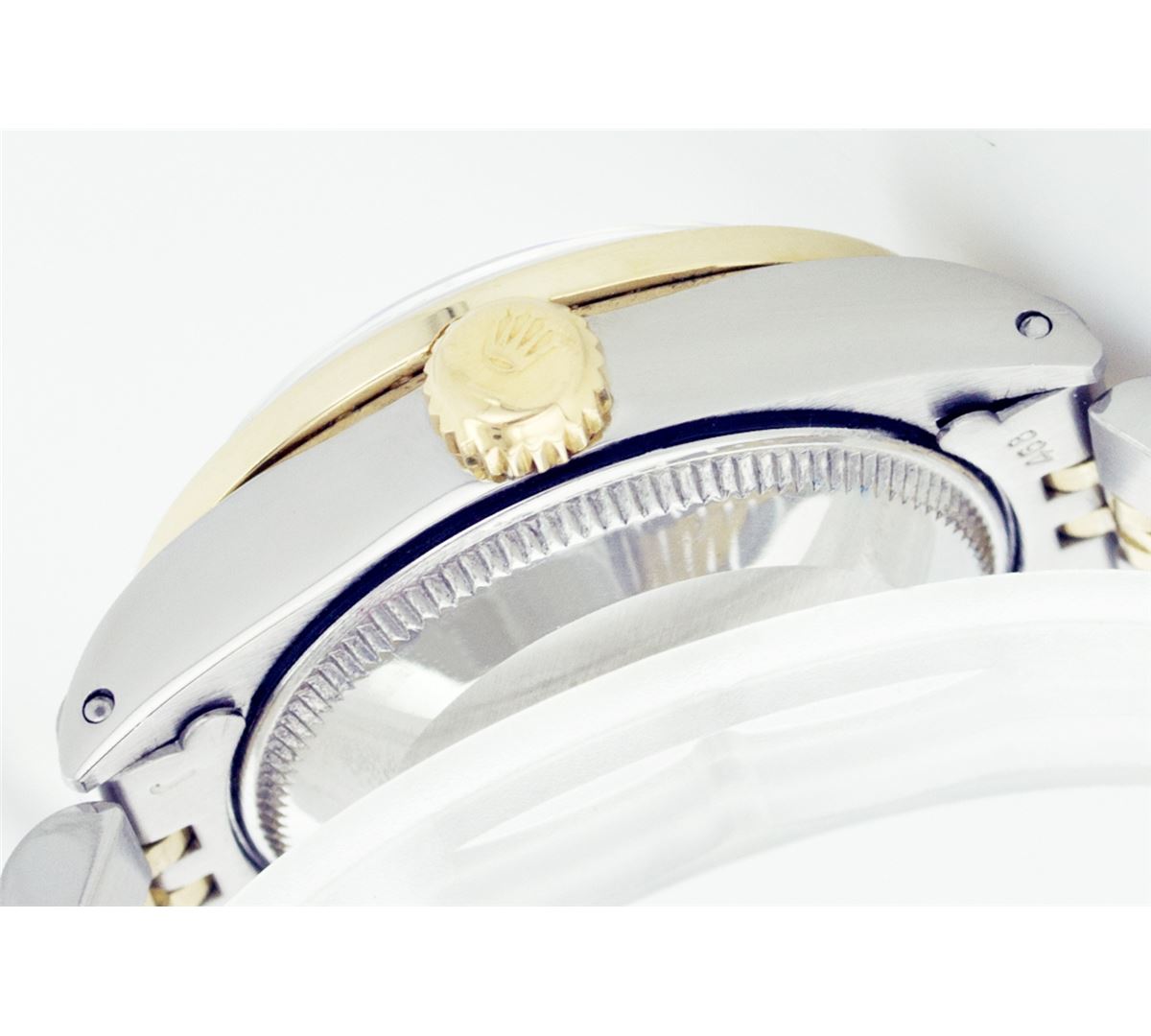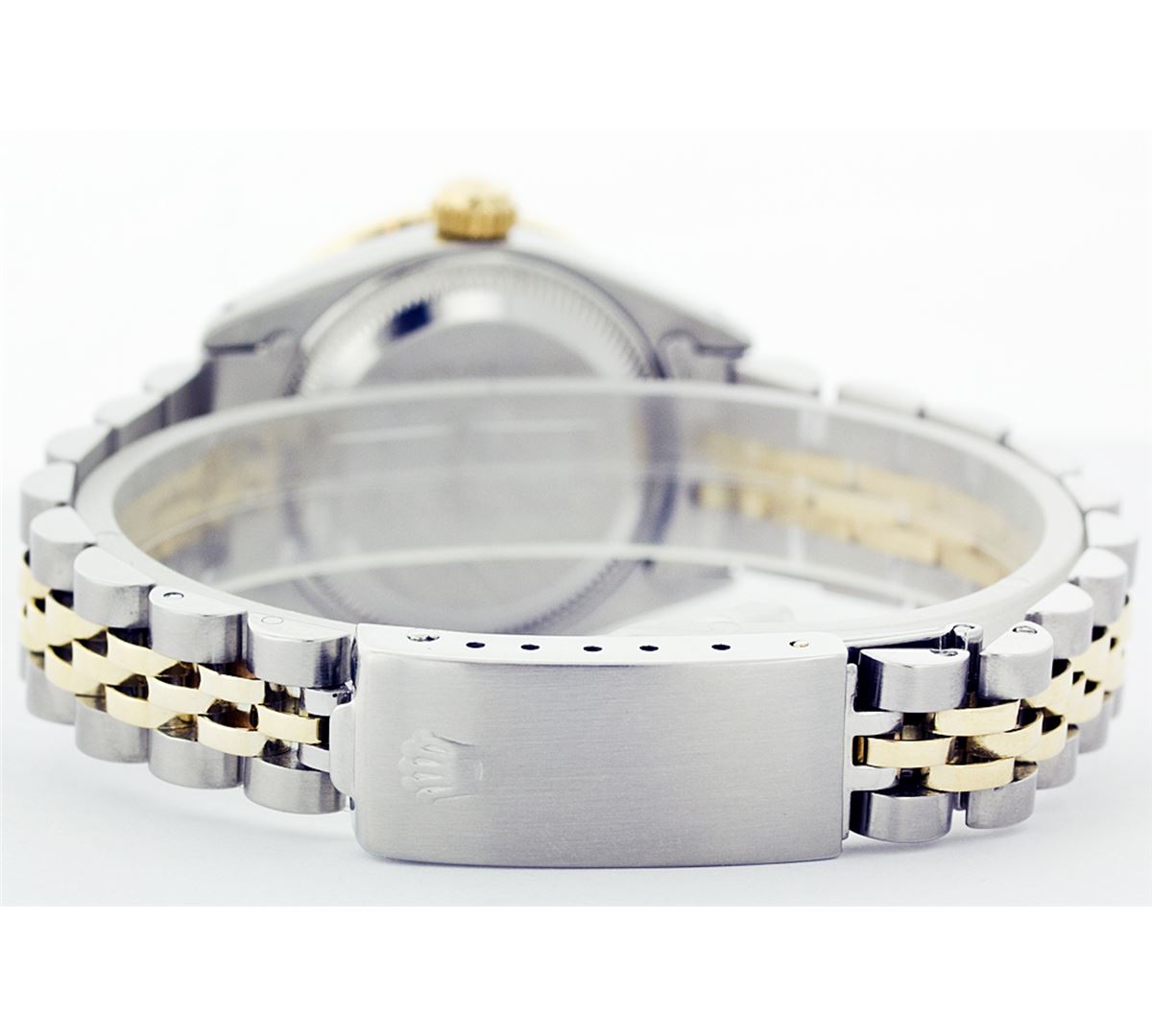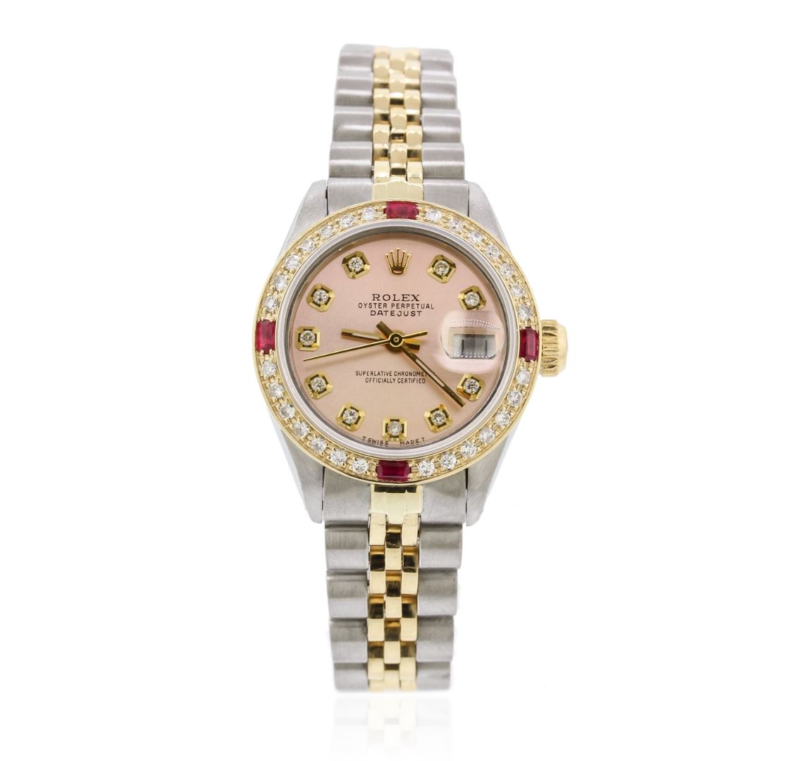 One Ladies Two Tone Rolex Datejust Polished, Serviced & Electronically Tested, 14K Yellow Gold & Stainless Steel Case:26mm, 14K Yellow Gold Crown, Custom Bezel: 18K Yellow Gold Ruby Beadset Diamond Bezel, Diamond Count: 28 Diamonds + 4 Rubies Total Weight .70 Carat, Clarity: Si-VS, Color: G to H. Custom Crystal: Synthetic Sapphire Cyclops Lens. Movement: Automatic Winding Movement Caliber 2030. Custom Dial: Light Pink With Diamond Hour Markers. 10 Diamonds In Dial, Clarity: Si-VS, Color: G to H. Date Window: 3 O'Clock Position Date Display, Non Quickset, Model: 6917 Condition: G-6 Extra Fine. Bracelet: Two Tone 14K Yellow Gold & Stainless Steel Jubilee. Bright Polish. 5.5 Inch Length, Adjustable. Standard Clasp, With Rolex Logo.