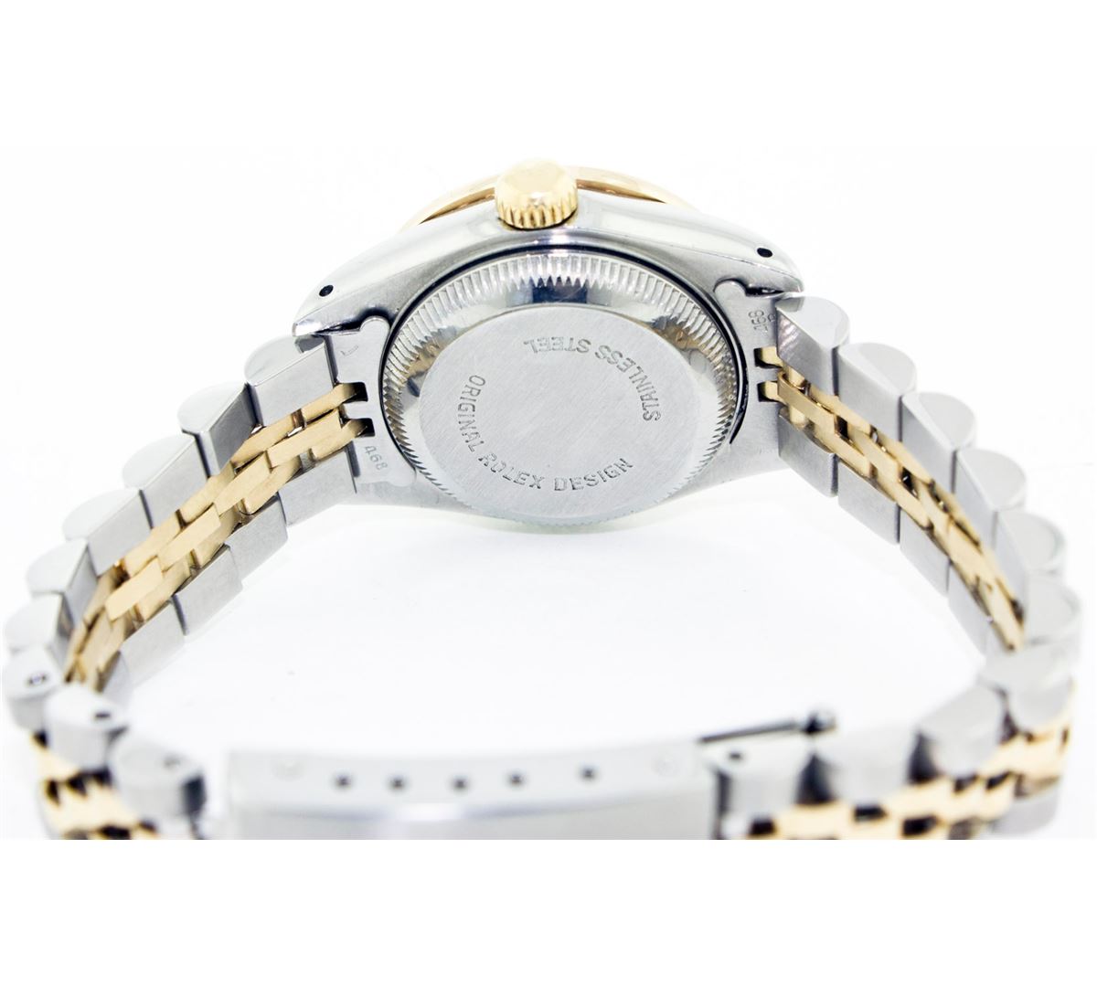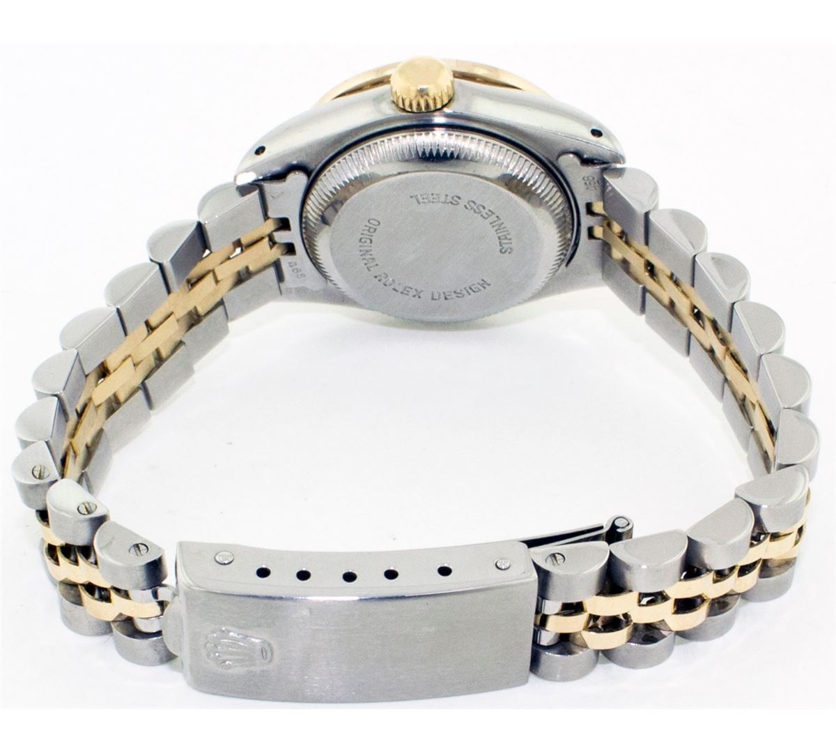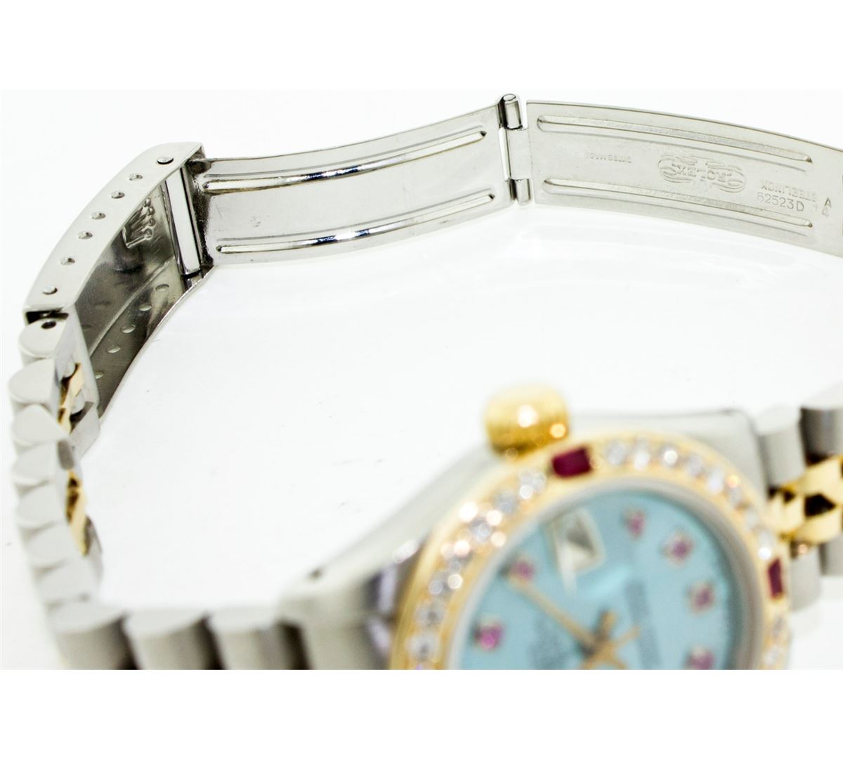 One Ladies Two Tone Rolex Datejust Polished, Serviced & Electronically Tested, 14K Yellow Gold & Stainless Steel Case:26mm, 14K Yellow Gold Crown, Custom Bezel: 18K Yellow Gold Ruby Beadset Diamond Bezel, Diamond Count: 28 Diamonds + 4 Rubies Total Weight .70 Carat, Clarity: Si-VS, Color: G to H. Custom Crystal: Synthetic Sapphire Cyclops Lens. Movement: Automatic Winding Movement Caliber 2030. Custom Dial: Blue Mother Of Pearl With Ruby Hour Markers, Stone Count: 10 Rubies. Date Window: 3 O'Clock Position Date Display, Non Quickset, Model: 6917 Condition: G-6 Extra Fine. Bracelet: Two Tone 14K Yellow Gold & Stainless Steel Jubilee. Bright Polish. 5.5 Inch Length, Adjustable. Standard Clasp, With Rolex Logo.