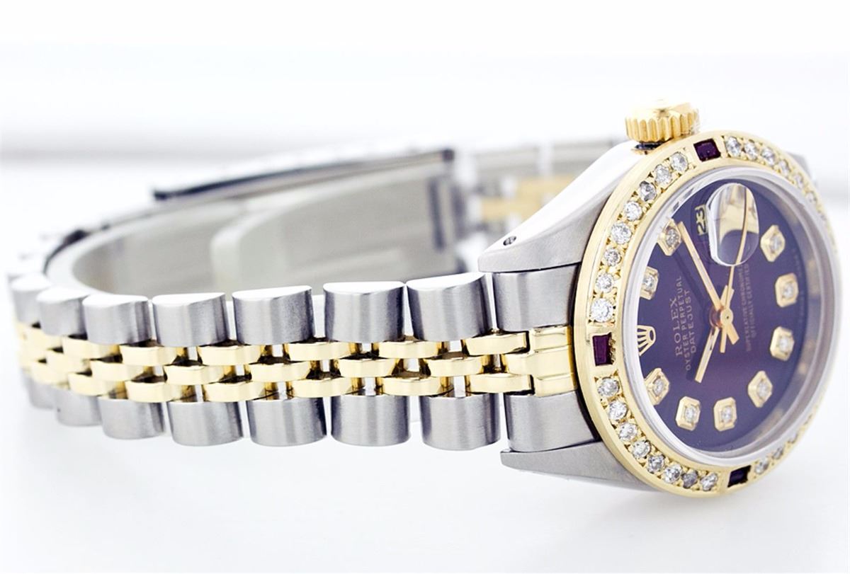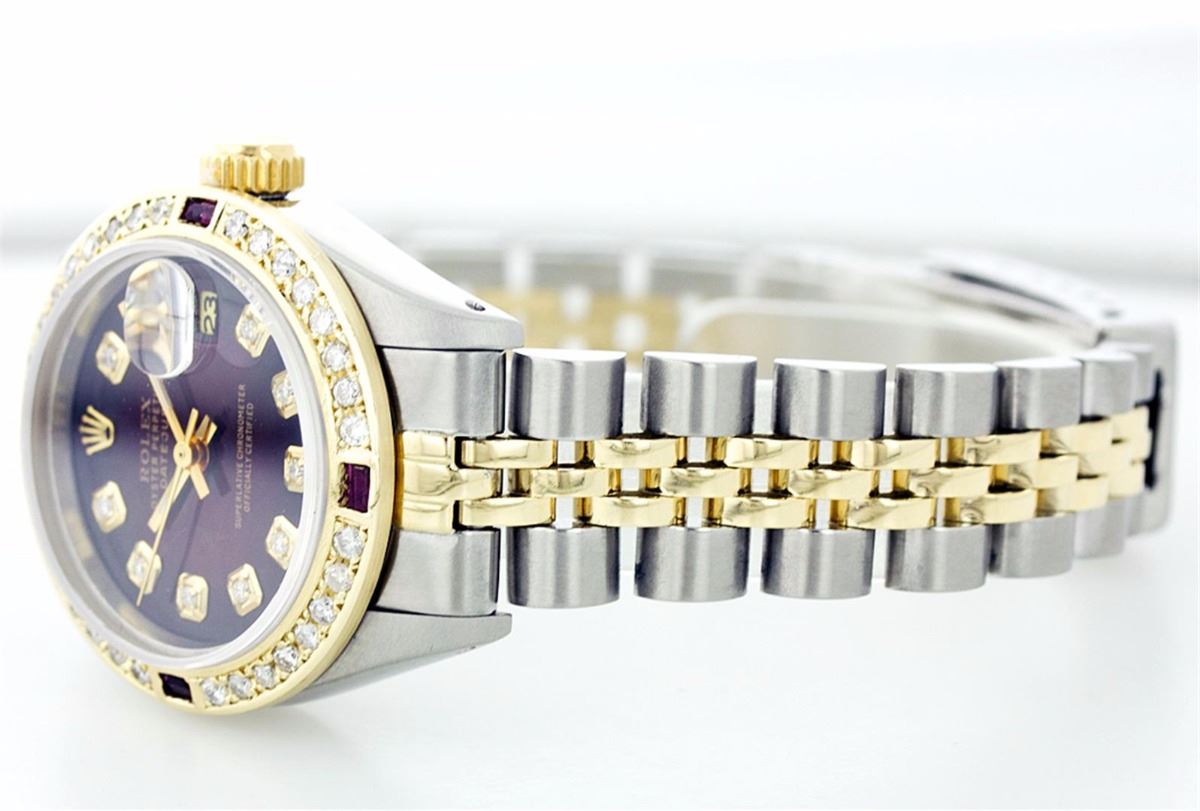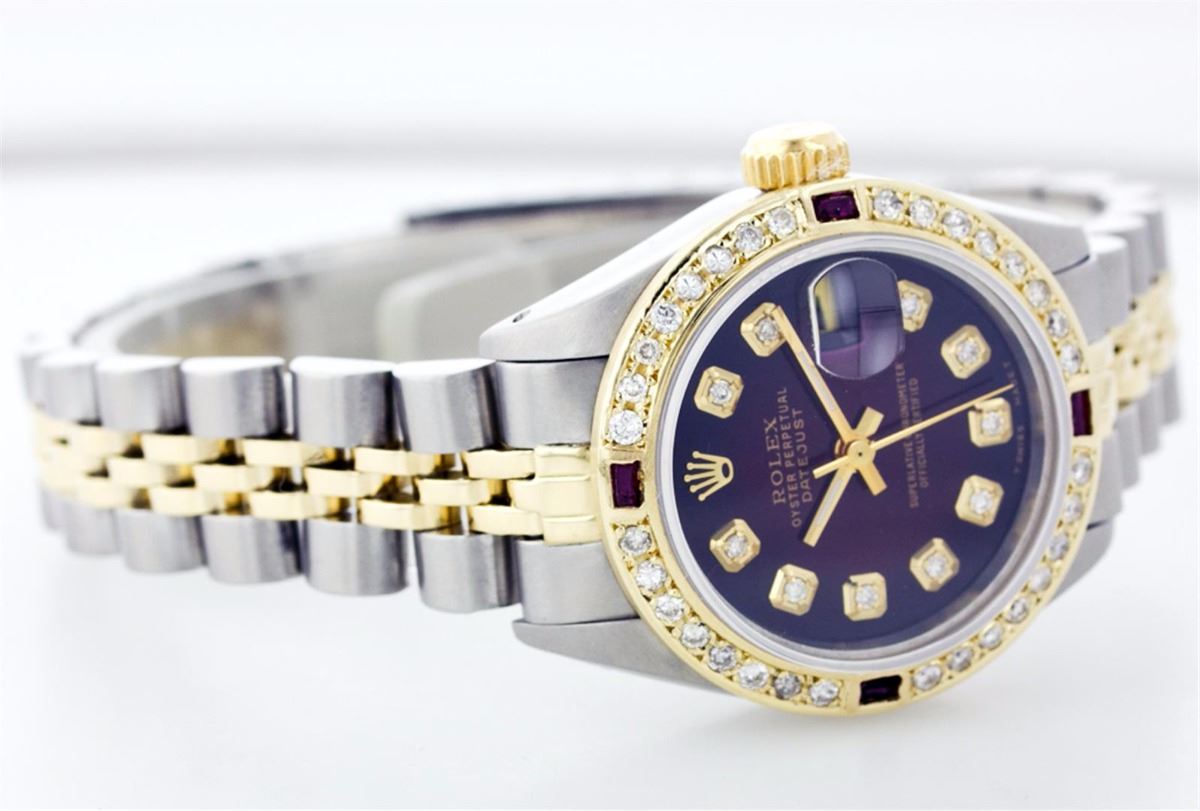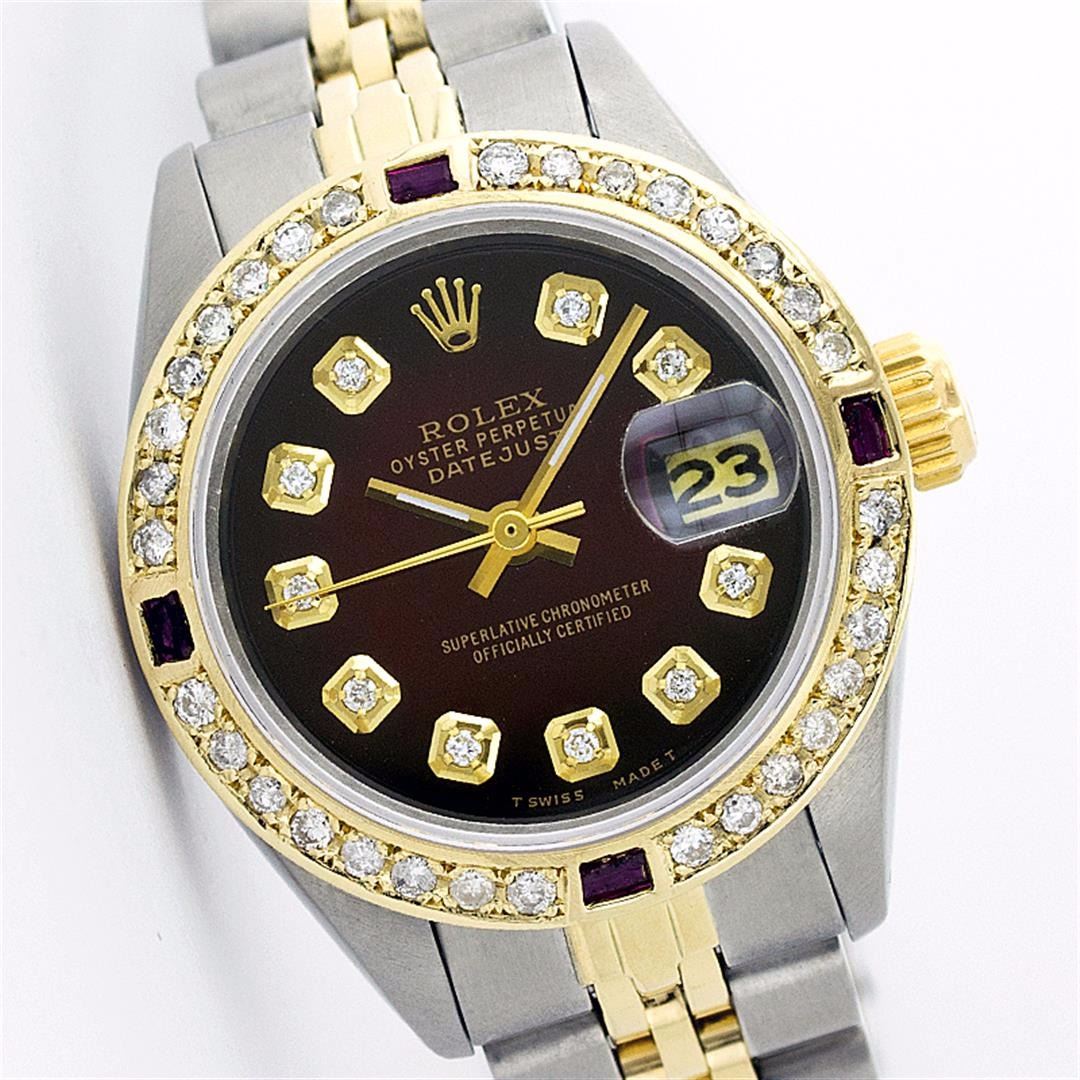 One Ladies Two Tone Rolex Datejust Polished, Serviced & Electronically Tested, 14K Yellow Gold & Stainless Steel Case:26mm, 14K Yellow Gold Crown, Custom Bezel: 18K Yellow Gold Ruby Beadset Diamond Bezel, Diamond Count: 28 Diamonds + 4 Rubies Total Weight .70 Carat, Clarity: Si-VS, Color: G to H. Custom Crystal: Synthetic Sapphire Cyclops Lens. Movement: Automatic Winding Movement Caliber 2030. Custom Dial: Red Vignette With Diamond Hour Markers. 10 Diamonds In Dial, Clarity: Si-VS, Color: G to H. Date Window: 3 O'Clock Position Date Display, Non Quickset, Model: 6917 Condition: G-6 Extra Fine. Bracelet: Two Tone 14K Yellow Gold & Stainless Steel Jubilee. Bright Polish. 5.5 Inch Length, Adjustable. Standard Clasp, With Rolex Logo.
