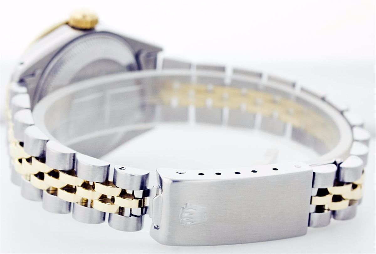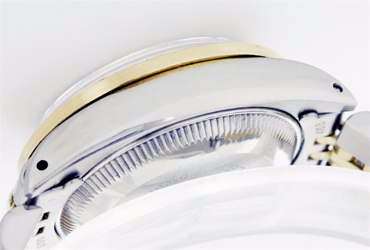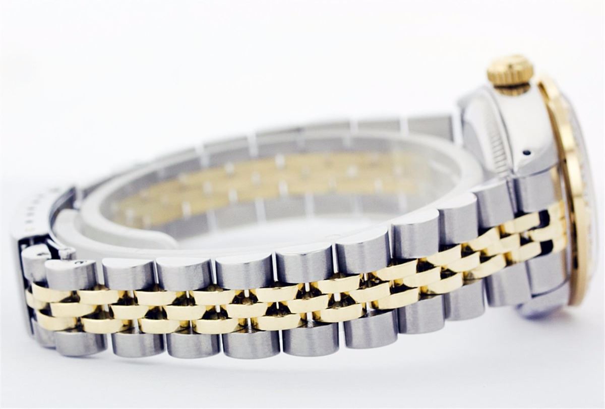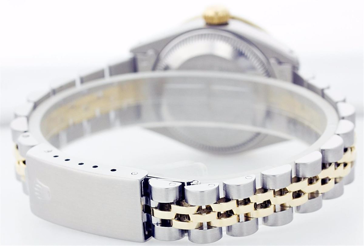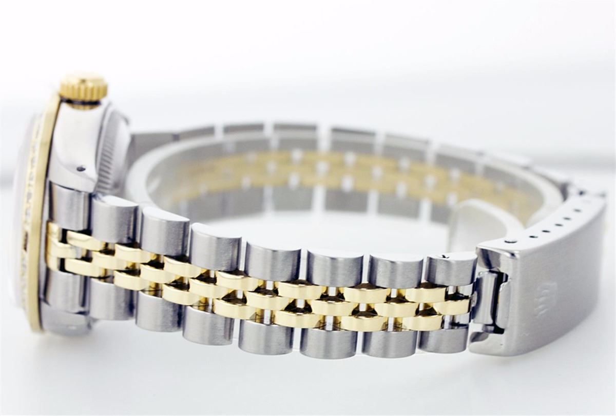One Ladies Two Tone Rolex Datejust Polished, Serviced & Electronically Tested, 14K Yellow Gold & Stainless Steel Case:26mm, 14K Yellow Gold Crown, Custom Bezel: 18K Yellow Gold Ruby Beadset Diamond Bezel, Diamond Count: 28 Diamonds + 4 Rubies Total Weight .70 Carat, Clarity: Si-VS, Color: G to H. Custom Crystal: Synthetic Sapphire Cyclops Lens. Movement: Automatic Winding Movement Caliber 2030. Custom Dial: Red Vignette With Diamond Hour Markers. 10 Diamonds In Dial, Clarity: Si-VS, Color: G to H. Date Window: 3 O'Clock Position Date Display, Non Quickset, Model: 6917 Condition: G-6 Extra Fine. Bracelet: Two Tone 14K Yellow Gold & Stainless Steel Jubilee. Bright Polish. 5.5 Inch Length, Adjustable. Standard Clasp, With Rolex Logo.