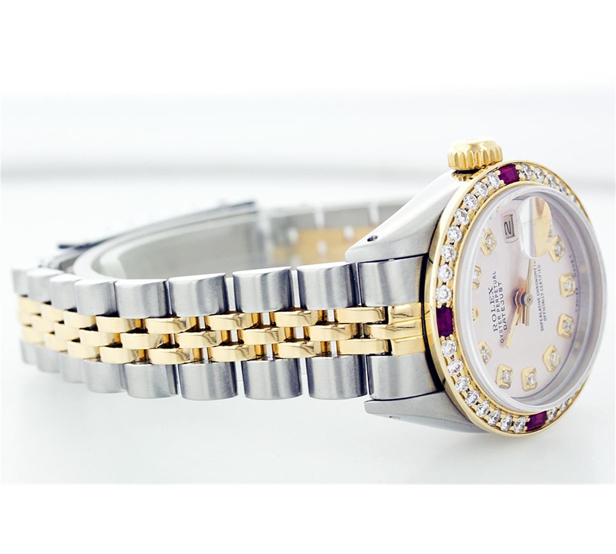 One Ladies Two Tone Rolex Datejust Polished, Serviced & Electronically Tested, 14K Yellow Gold & Stainless Steel Case:26mm, 14K Yellow Gold Crown, Custom Bezel: 18K Yellow Gold Ruby Beadset Diamond Bezel, Diamond Count: 28 Diamonds + 4 Rubies Total Weight .70 Carat, Clarity: Si-VS, Color: G to H. Custom Crystal: Synthetic Sapphire Cyclops Lens. Movement: Automatic Winding Movement Caliber 2030. Custom Dial: Light Pink With Diamond Hour Markers. 10 Diamonds In Dial, Clarity: Si-VS, Color: G to H. Date Window: 3 O'Clock Position Date Display, Non Quickset, Model: 6917 Condition: G-6 Extra Fine. Bracelet: Two Tone 14K Yellow Gold & Stainless Steel Jubilee. Bright Polish. 5.5 Inch Length, Adjustable. Standard Clasp, With Rolex Logo.