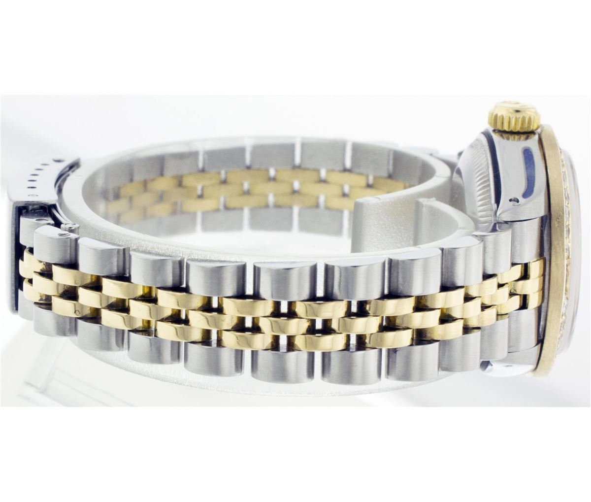 One Ladies Two Tone Rolex Datejust Polished, Serviced & Electronically Tested, 14K Yellow Gold & Stainless Steel Case:26mm, 14K Yellow Gold Crown, Custom Bezel: 18K Yellow Gold Ruby Beadset Diamond Bezel, Diamond Count: 28 Diamonds + 4 Rubies Total Weight .70 Carat, Clarity: Si-VS, Color: G to H. Custom Crystal: Synthetic Sapphire Cyclops Lens. Movement: Automatic Winding Movement Caliber 2030. Custom Dial: Mother Of Pearl With Ruby String Diamond Hour Markers. 10 Rubies +33 Diamonds In Dial, Clarity: Si-VS, Color: G to H. Date Window: 3 O'Clock Position Date Display, Non Quickset, Model: 6917 Condition: G-6 Extra Fine. Bracelet: Two Tone 14K Yellow Gold & Stainless Steel Jubilee. Bright Polish. 5.5 Inch Length, Adjustable. Standard Clasp, With Rolex Logo.