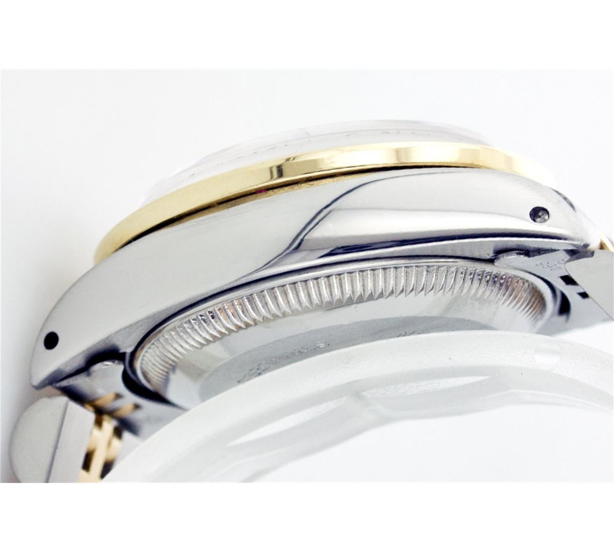 One Ladies Two Tone Rolex Datejust Polished, Serviced & Electronically Tested, 14K Yellow Gold & Stainless Steel Case:26mm, 14K Yellow Gold Crown, Custom Bezel: 18K Yellow Gold Ruby Beadset Diamond Bezel, Diamond Count: 28 Diamonds + 4 Rubies Total Weight .70 Carat, Clarity: Si-VS, Color: G to H. Custom Crystal: Synthetic Sapphire Cyclops Lens. Movement: Automatic Winding Movement Caliber 2030. Custom Dial: Mother Of Pearl Ruby String Diamond Hour Markers. 10 Rubies In Dial + 33 Diamonds, Clarity: Si-VS, Color: G to H. Date Window: 3 O'Clock Position Date Display, Non Quickset, Model: 6917 Condition: G-6 Extra Fine. Bracelet: Two Tone 14K Yellow Gold & Stainless Steel Jubilee. Bright Polish. 5.5 Inch Length, Adjustable. Standard Clasp, With Rolex Logo.