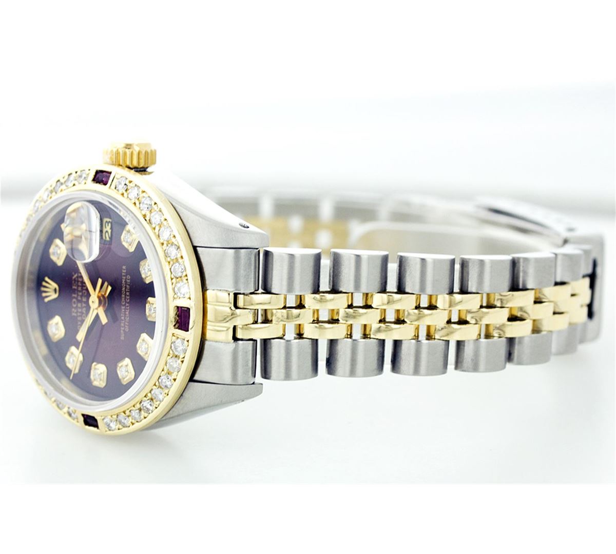 One Ladies Two Tone Rolex Datejust Polished, Serviced & Electronically Tested, 14K Yellow Gold & Stainless Steel Case:26mm, 14K Yellow Gold Crown, Custom Bezel: 18K Yellow Gold Ruby Beadset Diamond Bezel, Diamond Count: 28 Diamonds + 4 Rubies Total Weight .70 Carat, Clarity: Si-VS, Color: G to H. Custom Crystal: Synthetic Sapphire Cyclops Lens. Movement: Automatic Winding Movement Caliber 2030. Custom Dial: Dark Red Vignette With Diamond Hour Markers. 10 Diamonds In Dial, Clarity: Si-VS, Color: G to H. Date Window: 3 O'Clock Position Date Display, Non Quickset, Model: 6917 Condition: G-6 Extra Fine. Bracelet: Two Tone 14K Yellow Gold & Stainless Steel Jubilee. Bright Polish. 5.5 Inch Length, Adjustable. Standard Clasp, With Rolex Logo.