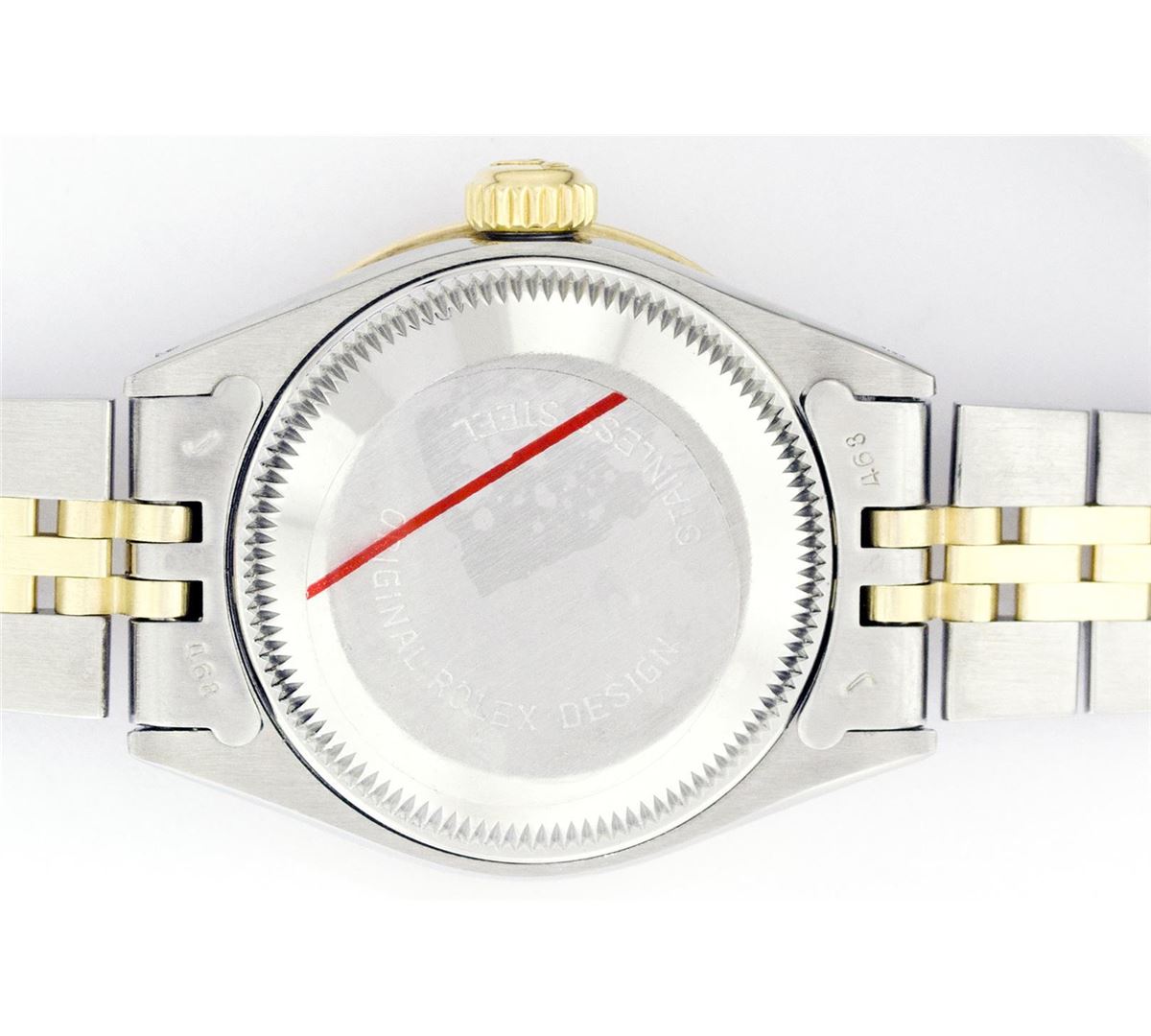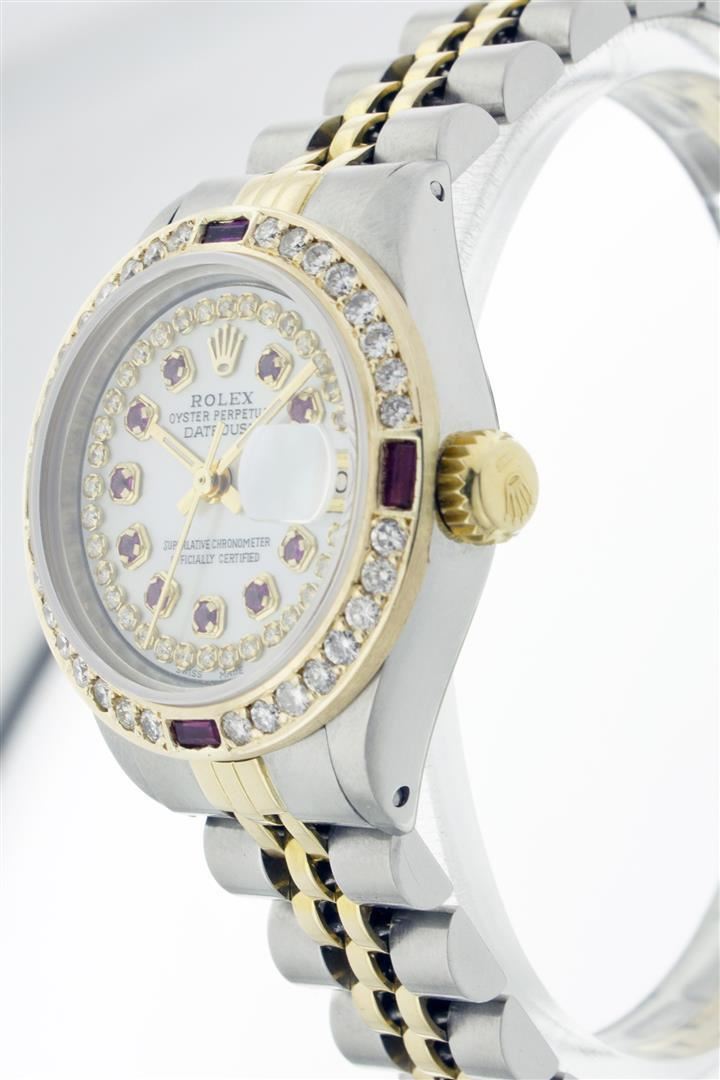 One Ladies Two Tone Rolex Datejust Polished, Serviced & Electronically Tested, 14K Yellow Gold & Stainless Steel Case:26mm, 14K Yellow Gold Crown, Custom Bezel: 18K Yellow Gold Ruby Beadset Diamond Bezel, Diamond Count: 28 Diamonds + 4 Rubies Total Weight .70 Carat, Clarity: Si-VS, Color: G to H. Custom Crystal: Synthetic Sapphire Cyclops Lens. Movement: Automatic Winding Movement Caliber 2030. Custom Dial: Mother Of Pearl With Ruby String Diamond Dial, Stone Count: 10 Rubies + 33 Diamonds. Date Window: 3 O'Clock Position Date Display, Non Quickset, Model: 6917 Condition: G-6 Extra Fine. Bracelet: Two Tone 14K Yellow Gold & Stainless Steel Jubilee. Bright Polish. 5.5 Inch Length, Adjustable. Standard Clasp, With Rolex Logo.
