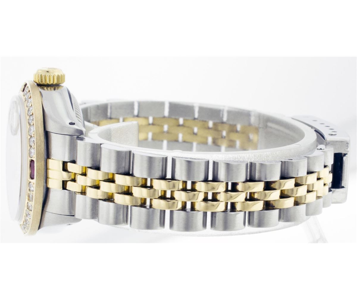 One Ladies Two Tone Rolex Datejust Polished, Serviced & Electronically Tested, 14K Yellow Gold & Stainless Steel Case:26mm, 14K Yellow Gold Crown, Custom Bezel: 18K Yellow Gold Ruby Beadset Diamond Bezel, Diamond Count: 28 Diamonds + 4 Rubies Total Weight .70 Carat, Clarity: Si-VS, Color: G to H. Custom Crystal: Synthetic Sapphire Cyclops Lens. Movement: Automatic Winding Movement Caliber 2030. Custom Dial: Pink Mother Of Pearl With Ruby String Diamond Dial, Stone Count: 10 Rubies + 33 Diamonds. Date Window: 3 O'Clock Position Date Display, Non Quickset, Model: 6917 Condition: G-6 Extra Fine. Bracelet: Two Tone 14K Yellow Gold & Stainless Steel Jubilee. Bright Polish. 5.5 Inch Length, Adjustable. Standard Clasp, With Rolex Logo.