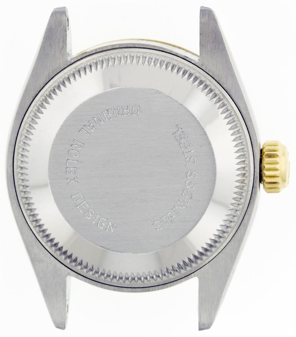 One Ladies Two Tone Rolex Datejust Polished, Serviced & Electronically Tested, 14K Yellow Gold & Stainless Steel Case:26mm, 14K Yellow Gold Crown, Custom Bezel: 18K Yellow Gold Ruby Beadset Diamond Bezel, Diamond Count: 28 Diamonds + 4 Rubies Total Weight .70 Carat, Clarity: Si-VS, Color: G to H. Custom Crystal: Synthetic Sapphire Cyclops Lens. Movement: Automatic Winding Movement Caliber 2030. Custom Dial: Mother Of Pearl With Ruby String Diamond Hour Markers. 10 Rubies +33 Diamonds In Dial, Clarity: Si-VS, Color: G to H. Date Window: 3 O'Clock Position Date Display, Non Quickset, Model: 6917 Condition: G-6 Extra Fine. Bracelet: Two Tone 14K Yellow Gold & Stainless Steel Jubilee. Bright Polish. 5.5 Inch Length, Adjustable. Standard Clasp, With Rolex Logo.