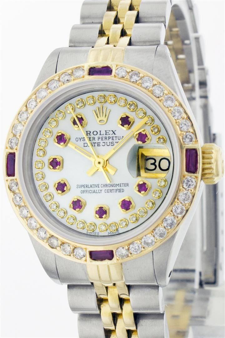 One Ladies Two Tone Rolex Datejust Polished, Serviced & Electronically Tested, 14K Yellow Gold & Stainless Steel Case:26mm, 14K Yellow Gold Crown, Custom Bezel: 18K Yellow Gold Ruby Beadset Diamond Bezel, Diamond Count: 28 Diamonds + 4 Rubies Total Weight .70 Carat, Clarity: Si-VS, Color: G to H. Custom Crystal: Synthetic Sapphire Cyclops Lens. Movement: Automatic Winding Movement Caliber 2030. Custom Dial: Mother Of Pearl With Ruby String Diamond Dial, Stone Count: 10 Rubies + 33 Diamonds. Date Window: 3 O'Clock Position Date Display, Non Quickset, Model: 6917 Condition: G-6 Extra Fine. Bracelet: Two Tone 14K Yellow Gold & Stainless Steel Jubilee. Bright Polish. 5.5 Inch Length, Adjustable. Standard Clasp, With Rolex Logo.