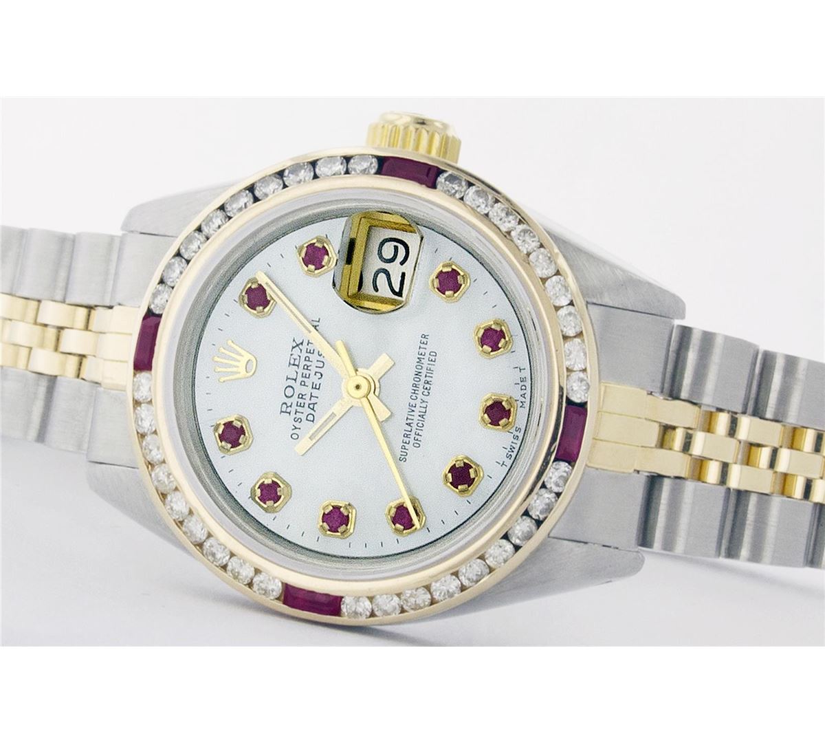 One Ladies Two Tone Rolex Datejust Polished, Serviced & Electronically Tested, 14K Yellow Gold & Stainless Steel Case:26mm, 14K Yellow Gold Crown, Custom Bezel: 18K Yellow Gold Ruby Channel Set Diamond Bezel, Diamond + Gem Count: 36 Diamonds + 4 Rubies Total Weight 1.00 Carat, Clarity: Si-VS, Color: G to H. Custom Crystal: Synthetic Sapphire Cyclops Lens. Movement: Automatic Winding Movement Caliber 2030. Custom Dial: Mother Of Pearl with Ruby Hour Markers, 10 Rubies. Date Window: 3 O'Clock Position Date Display, Non Quickset, Model: 6917 Condition: G-6 Extra Fine. Bracelet: Two Tone 14K Yellow Gold & Stainless Steel Jubilee. Bright Polish. 5.5 Inch Length, Adjustable. Standard Clasp, With Rolex Logo.