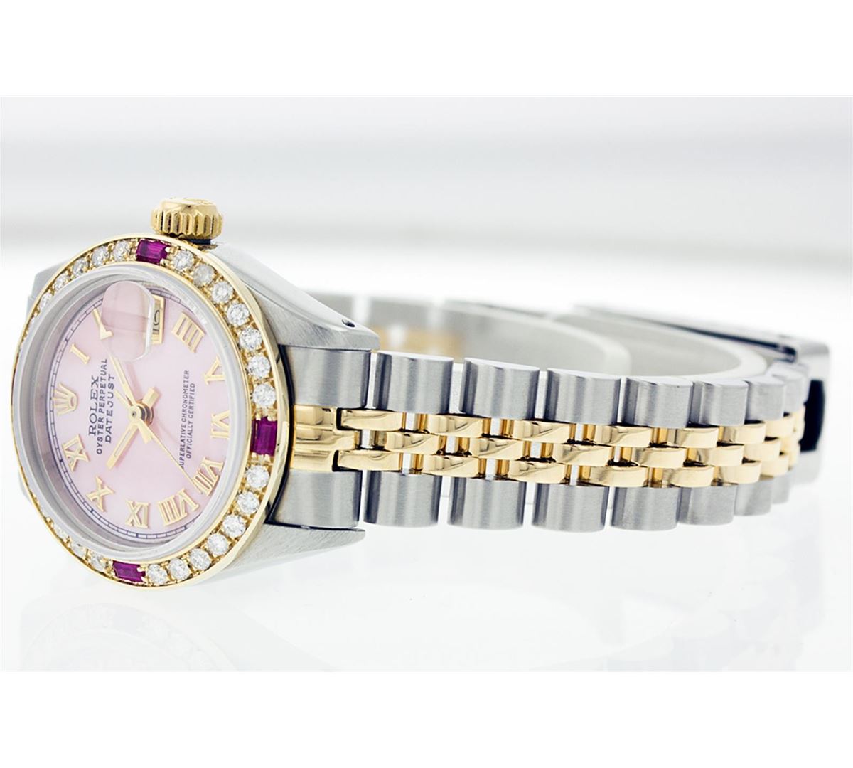One Ladies Two Tone Rolex Datejust Polished, Serviced & Electronically Tested, 14K Yellow Gold & Stainless Steel Case: 26mm, 14K Yellow Gold Crown, Custom Bezel: 18K Yellow Gold Ruby Beadset Diamond Bezel, Diamond Count: 28 Diamonds + 4 Rubies Total Weight .70 Carat, Clarity: Si-VS, Color: G to H. Custom Crystal: Synthetic Sapphire Cyclops Lens. Movement: Automatic Winding Movement Caliber 2030. Custom Dial: Pink Mother Of Pearl Dial Set With Roman Hour Markers. Date Window: 3 O'Clock Position Date Display, Non Quickset, Model: 6917 Condition: G-6 Extra Fine. Bracelet: Two Tone 14K Yellow Gold & Stainless Steel Jubilee. Bright Polish. 5.5 Inch Length, Adjustable. Standard Clasp, With Rolex Logo.