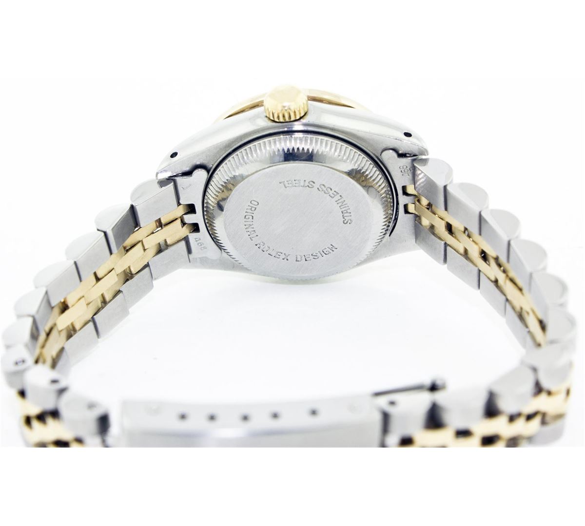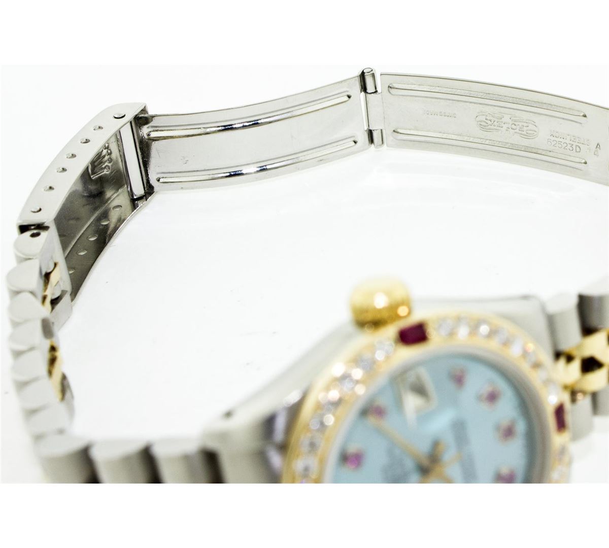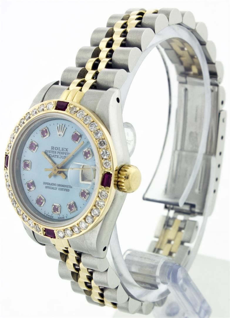 One Ladies Two Tone Rolex Datejust Polished, Serviced & Electronically Tested, 14K Yellow Gold & Stainless Steel Case:26mm, 14K Yellow Gold Crown, Custom Bezel: 18K Yellow Gold Ruby Beadset Diamond Bezel, Diamond Count: 28 Diamonds + 4 Rubies Total Weight .70 Carat, Clarity: Si-VS, Color: G to H. Custom Crystal: Synthetic Sapphire Cyclops Lens. Movement: Automatic Winding Movement Caliber 2030. Custom Dial: Blue Mother Of Pearl With Ruby Hour Markers, Stone Count: 10 Rubies. Date Window: 3 O'Clock Position Date Display, Non Quickset, Model: 6917 Condition: G-6 Extra Fine. Bracelet: Two Tone 14K Yellow Gold & Stainless Steel Jubilee. Bright Polish. 5.5 Inch Length, Adjustable. Standard Clasp, With Rolex Logo.