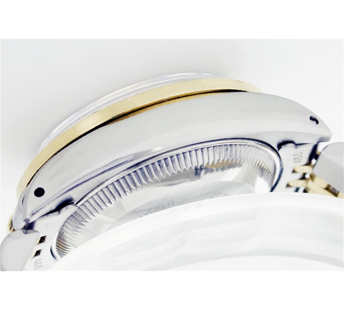 One Ladies Two Tone Rolex Datejust Polished, Serviced & Electronically Tested, 14K Yellow Gold & Stainless Steel Case:26mm, 14K Yellow Gold Crown, Custom Bezel: 18K Yellow Gold Ruby Beadset Diamond Bezel, Diamond Count: 28 Diamonds + 4 Rubies Total Weight .70 Carat, Clarity: Si-VS, Color: G to H. Custom Crystal: Synthetic Sapphire Cyclops Lens. Movement: Automatic Winding Movement Caliber 2030. Custom Dial: Dark Red Vignette With Diamond Hour Markers. 10 Diamonds In Dial, Clarity: Si-VS, Color: G to H. Date Window: 3 O'Clock Position Date Display, Non Quickset, Model: 6917 Condition: G-6 Extra Fine. Bracelet: Two Tone 14K Yellow Gold & Stainless Steel Jubilee. Bright Polish. 5.5 Inch Length, Adjustable. Standard Clasp, With Rolex Logo.