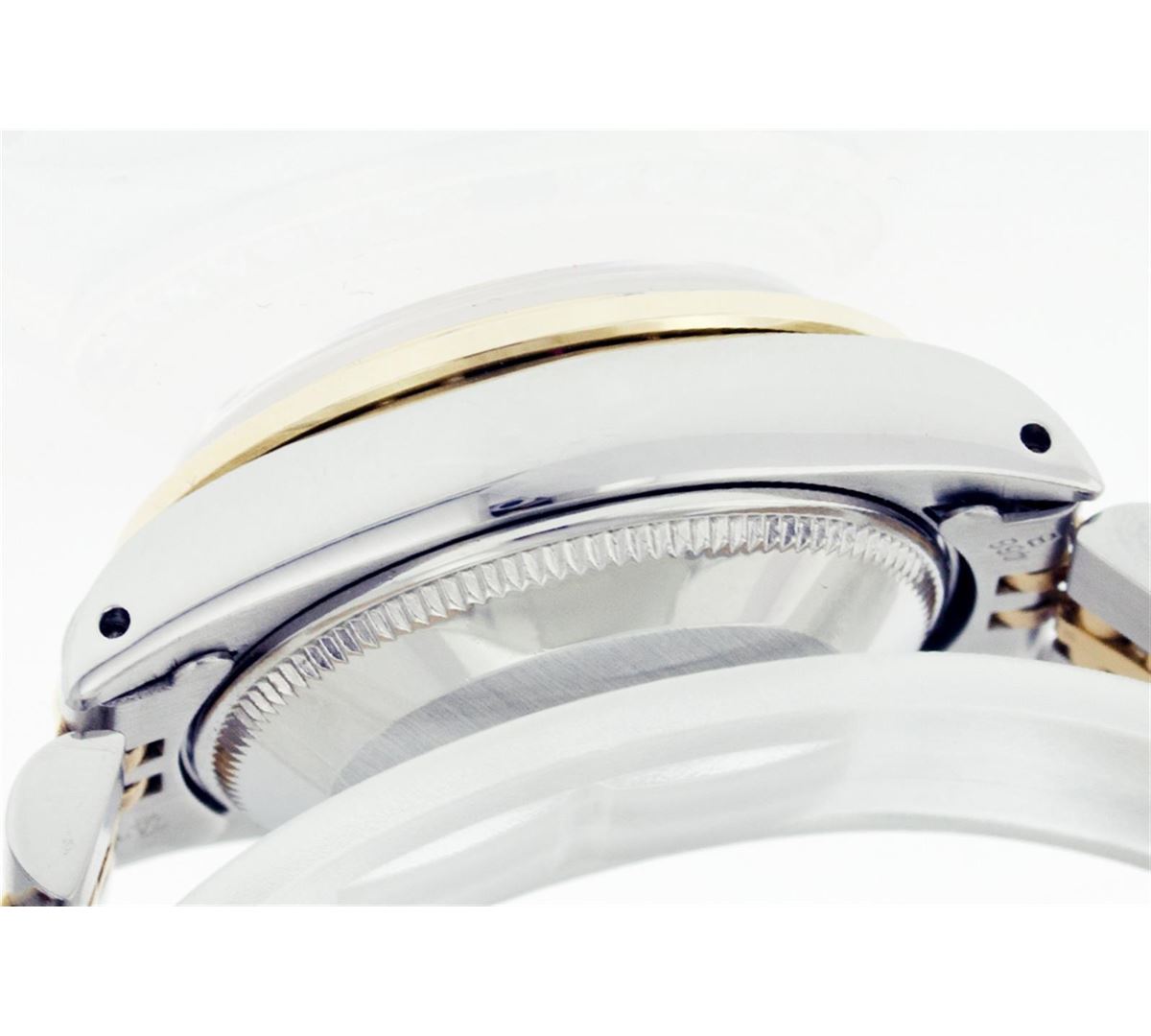 One Ladies Two Tone Rolex Datejust Polished, Serviced & Electronically Tested, 14K Yellow Gold & Stainless Steel Case: 26mm, 14K Yellow Gold Crown, Custom Bezel: 18K Yellow Gold Ruby Beadset Diamond Bezel, Diamond Count: 28 Diamonds + 4 Rubies Total Weight .70 Carat, Clarity: Si-VS, Color: G to H. Custom Crystal: Synthetic Sapphire Cyclops Lens. Movement: Automatic Winding Movement Caliber 2030. Custom Dial: Pink Mother Of Pearl Dial Set With Roman Hour Markers. Date Window: 3 O'Clock Position Date Display, Non Quickset, Model: 6917 Condition: G-6 Extra Fine. Bracelet: Two Tone 14K Yellow Gold & Stainless Steel Jubilee. Bright Polish. 5.5 Inch Length, Adjustable. Standard Clasp, With Rolex Logo.