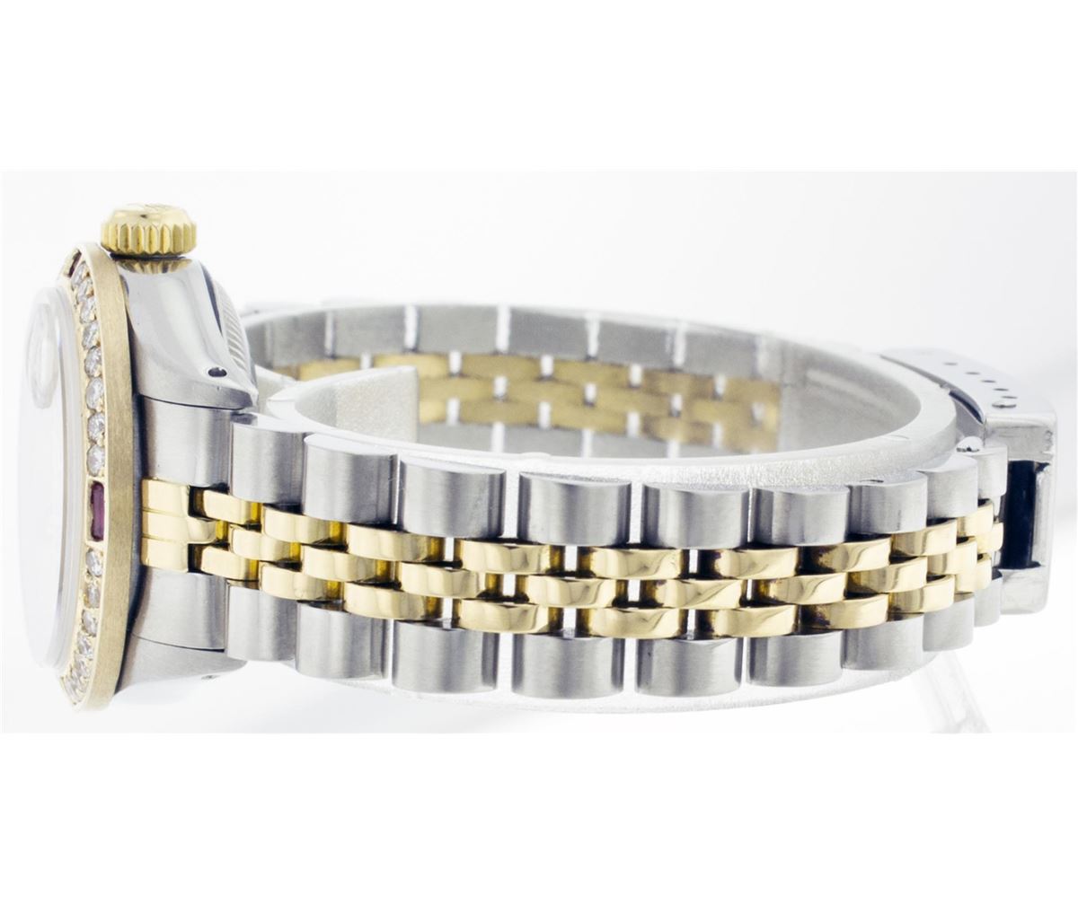One Ladies Two Tone Rolex Datejust Polished, Serviced & Electronically Tested, 14K Yellow Gold & Stainless Steel Case:26mm, 14K Yellow Gold Crown, Custom Bezel: 18K Yellow Gold Ruby Beadset Diamond Bezel, Diamond Count: 28 Diamonds + 4 Rubies Total Weight .70 Carat, Clarity: Si-VS, Color: G to H. Custom Crystal: Synthetic Sapphire Cyclops Lens. Movement: Automatic Winding Movement Caliber 2030. Custom Dial: Mother Of Pearl With Ruby String Diamond Hour Markers. 10 Rubies +33 Diamonds In Dial, Clarity: Si-VS, Color: G to H. Date Window: 3 O'Clock Position Date Display, Non Quickset, Model: 6917 Condition: G-6 Extra Fine. Bracelet: Two Tone 14K Yellow Gold & Stainless Steel Jubilee. Bright Polish. 5.5 Inch Length, Adjustable. Standard Clasp, With Rolex Logo.
