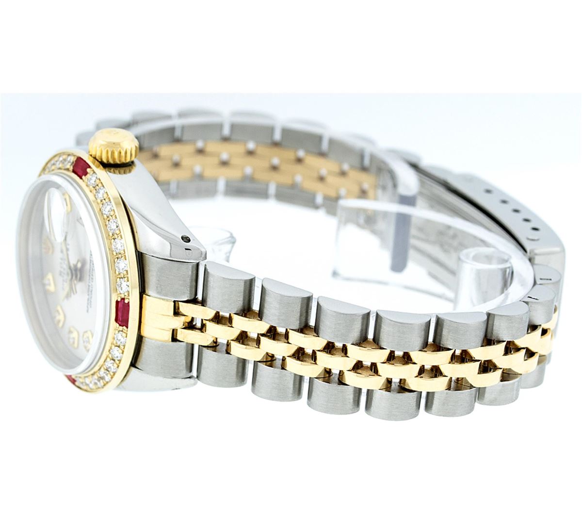 One Ladies Two Tone Rolex Datejust Polished, Serviced & Electronically Tested, 14K Yellow Gold & Stainless Steel Case:26mm, 14K Yellow Gold Crown, Custom Bezel: 18K Yellow Gold Ruby Beadset Diamond Bezel, Diamond Count: 28 Diamonds + 4 Rubies Total Weight .70 Carat, Clarity: Si-VS, Color: G to H. Custom Crystal: Synthetic Sapphire Cyclops Lens. Movement: Automatic Winding Movement Caliber 2030. Custom Dial: Silver With Diamond Hour Markers. 10 Diamonds In Dial, Clarity: Si-VS, Color: G to H. Date Window: 3 O'Clock Position Date Display, Model: Datejust, Condition: G-6 Extra Fine. Bracelet: Two Tone 14K Yellow Gold & Stainless Steel Jubilee. Bright Polish. 6.0 Inch Length, Adjustable. Standard Clasp, With Rolex Logo. Comes with 6 month warranty.
