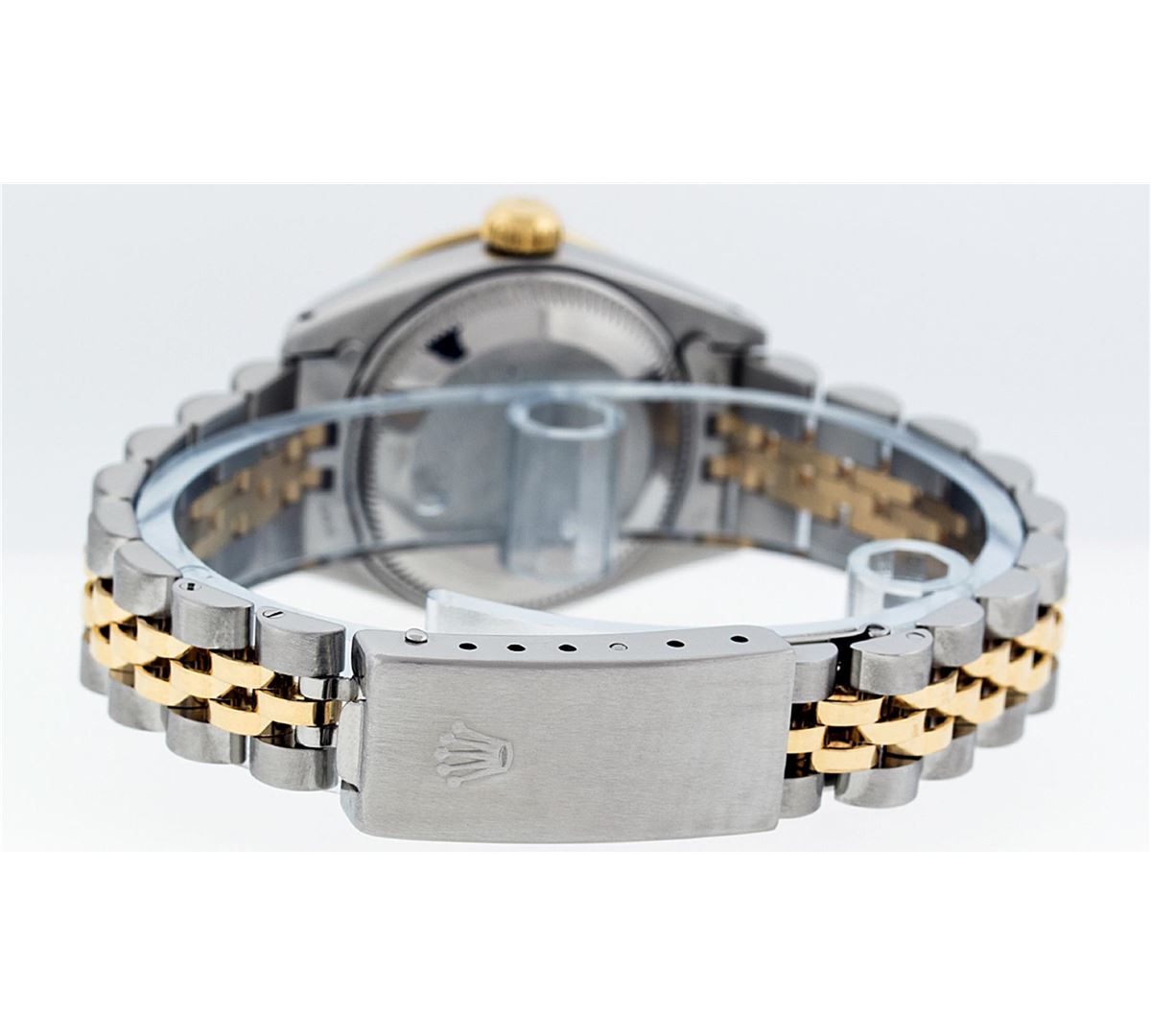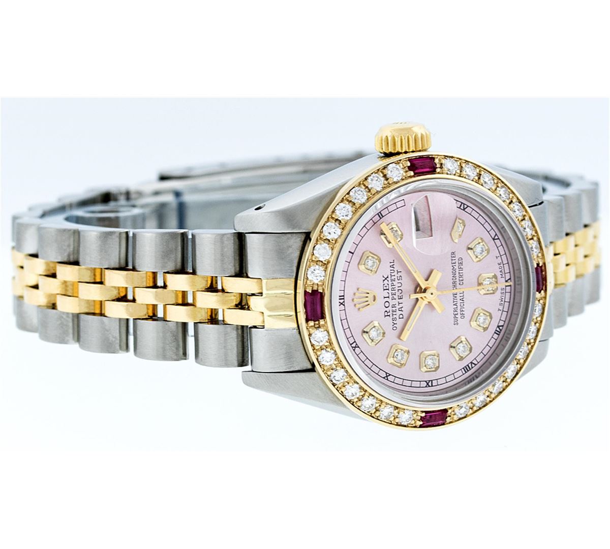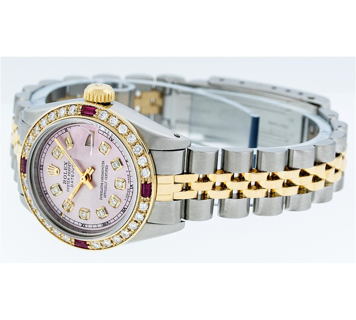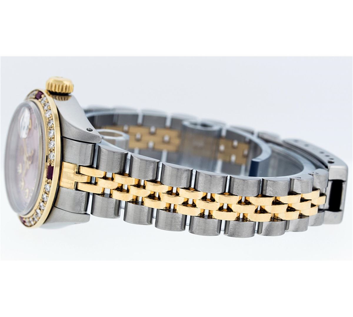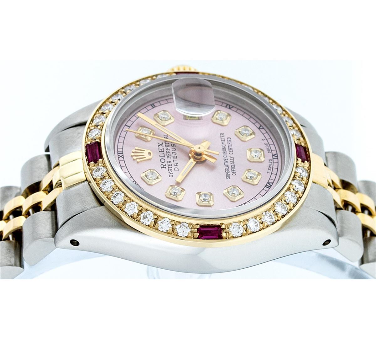 One Ladies Two Tone Rolex Datejust Polished, Serviced & Electronically Tested, 14K Yellow Gold & Stainless Steel Case:26mm, 14K Yellow Gold Crown, Custom Bezel: 18K Yellow Gold Ruby Beadset Diamond Bezel, Diamond Count: 28 Diamonds + 4 Rubies Total Weight .70 Carat, Clarity: Si-VS, Color: G to H. Custom Crystal: Synthetic Sapphire Cyclops Lens. Movement: Automatic Winding Movement Caliber 2030. Custom Dial: Ice Pink Diamond Dial With Square Roman Track, Stone Count: 10 Diamonds in Dial. Date Window: 3 O'Clock Position Date Display, Non Quickset, Model: Datejust Condition: G-6 Extra Fine. Bracelet: Two Tone 14K Yellow Gold & Stainless Steel Jubilee. Bright Polish. 6.0 Inch Length, Adjustable. Standard Clasp, With Rolex Logo.