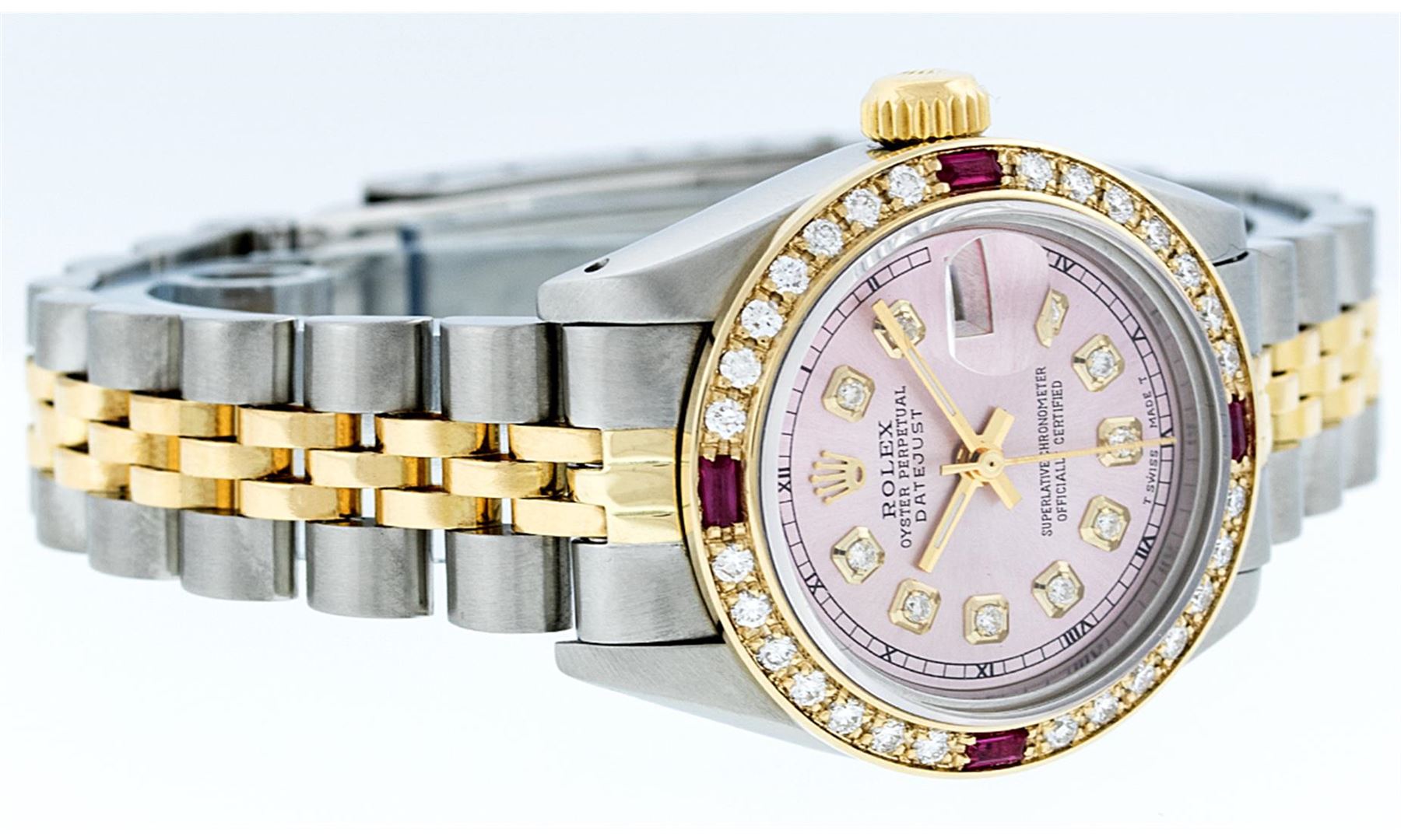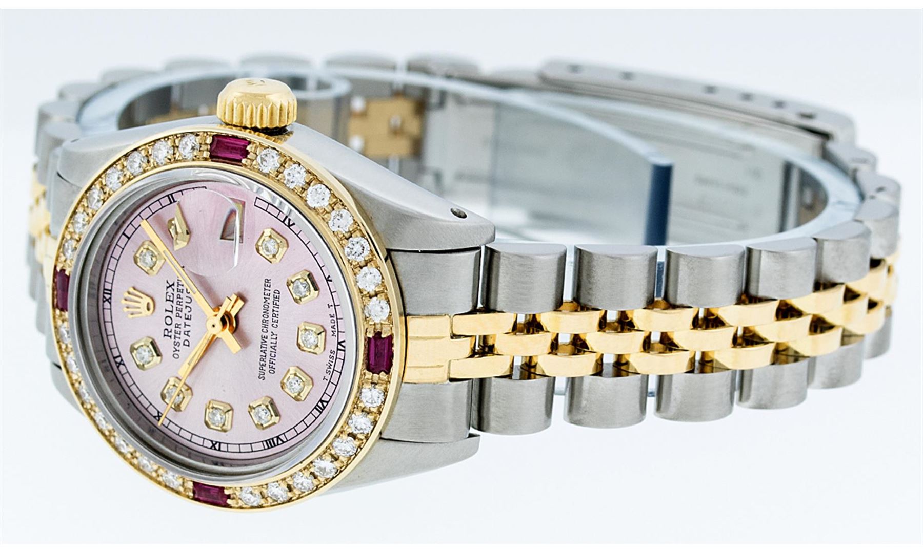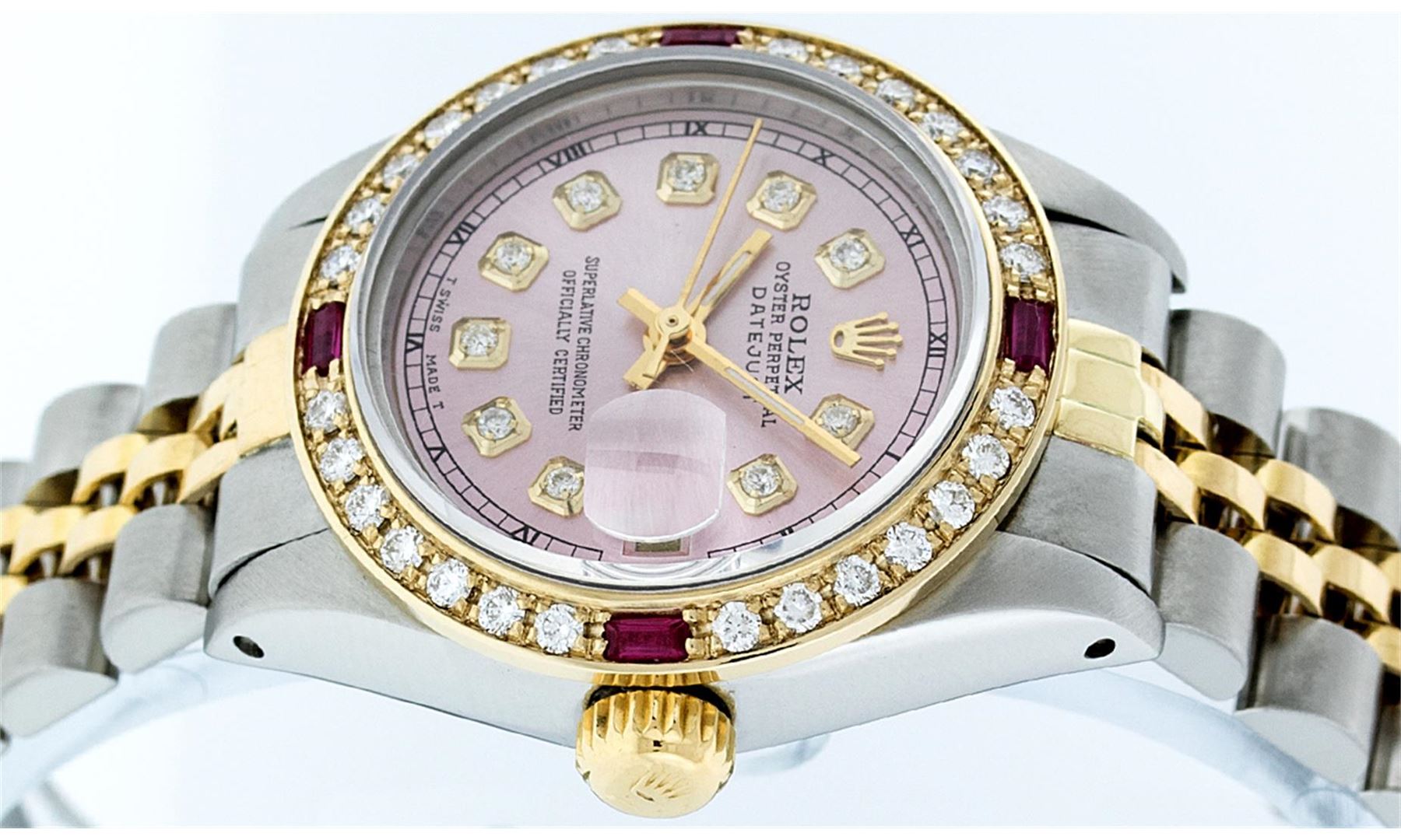 One Ladies Two Tone Rolex Datejust Polished, Serviced & Electronically Tested, 14K Yellow Gold & Stainless Steel Case:26mm, 14K Yellow Gold Crown, Custom Bezel: 18K Yellow Gold Ruby Beadset Diamond Bezel, Diamond Count: 28 Diamonds + 4 Rubies Total Weight .70 Carat, Clarity: Si-VS, Color: G to H. Custom Crystal: Synthetic Sapphire Cyclops Lens. Movement: Automatic Winding Movement Caliber 2030. Custom Dial: Ice Pink Diamond Dial With Square Roman Track, Stone Count: 10 Diamonds in Dial. Date Window: 3 O'Clock Position Date Display, Non Quickset, Model: Datejust Condition: G-6 Extra Fine. Bracelet: Two Tone 14K Yellow Gold & Stainless Steel Jubilee. Bright Polish. 6.0 Inch Length, Adjustable. Standard Clasp, With Rolex Logo.