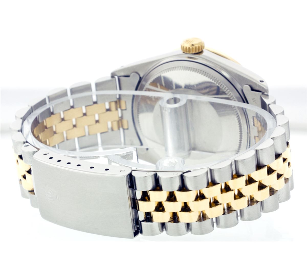 One Mens Two Tone Rolex Datejust Polished, Serviced & Electronically Tested, 14K Yellow Gold & Stainless Steel Case:36mm, 14K Yellow Gold Crown, Custom Bezel: 18K Yellow Gold Ruby Beadset Diamond Bezel, Diamond + Gem Count: 38 Diamonds + 4 Rubies Total Weight 1.00 Carat, Clarity: Si-VS, Color: G to H. Custom Crystal: Synthetic Sapphire Cyclops Lens. Movement: Automatic Winding Movement Caliber 3035. Custom Dial: Chocolate Dial Set With Baguette Hour Markers, 8 Baguettes + 2 Ruby Baguettes in Dial, Dial Weight: .40 Carat G To H In Color, Clarity: SI-VS Date Window: 3 O'Clock Position Date Display, Quickset, Model: 16013 Condition: G-6 Extra Fine. Bracelet: Two Tone 14K Yellow Gold & Stainless Steel Jubilee. Bright Polish. 6.5 Inch Length, Adjustable. Standard Clasp, With Rolex Logo.