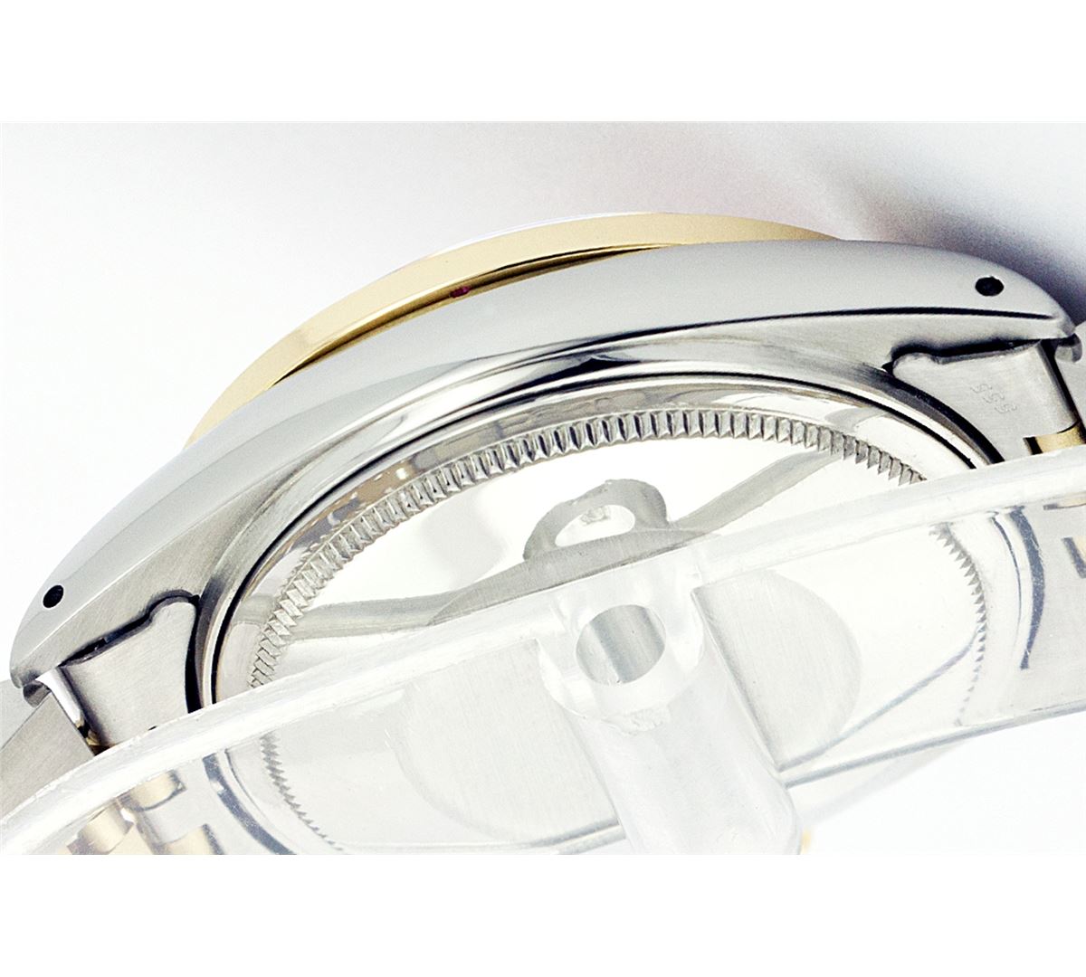 One Mens Two Tone Rolex Datejust Polished, Serviced & Electronically Tested, 14K Yellow Gold & Stainless Steel Case:36mm, 14K Yellow Gold Crown, Custom Bezel: 18K Yellow Gold Ruby Beadset Diamond Bezel, Diamond Count: 36 Diamonds + 4 Rubies Total Weight 1.00 Carat, Clarity: Si-VS, Color: G to H. Custom Crystal: Synthetic Sapphire Cyclops Lens. Movement: Automatic Winding Movement Caliber 3035. Custom Dial: Salmon Dial Set With Diamond Hour Markers, 10 Diamond in Dial G To H In Color, SI-VS Clarity. Date Window: 3 O'Clock Position Date Display, Quickset, Model: 16013 Condition: G-6 Extra Fine. Bracelet: Two Tone 14K Yellow Gold & Stainless Steel Jubilee. Bright Polish. 6.5 Inch Length, Adjustable. Standard Clasp, With Rolex Logo.
