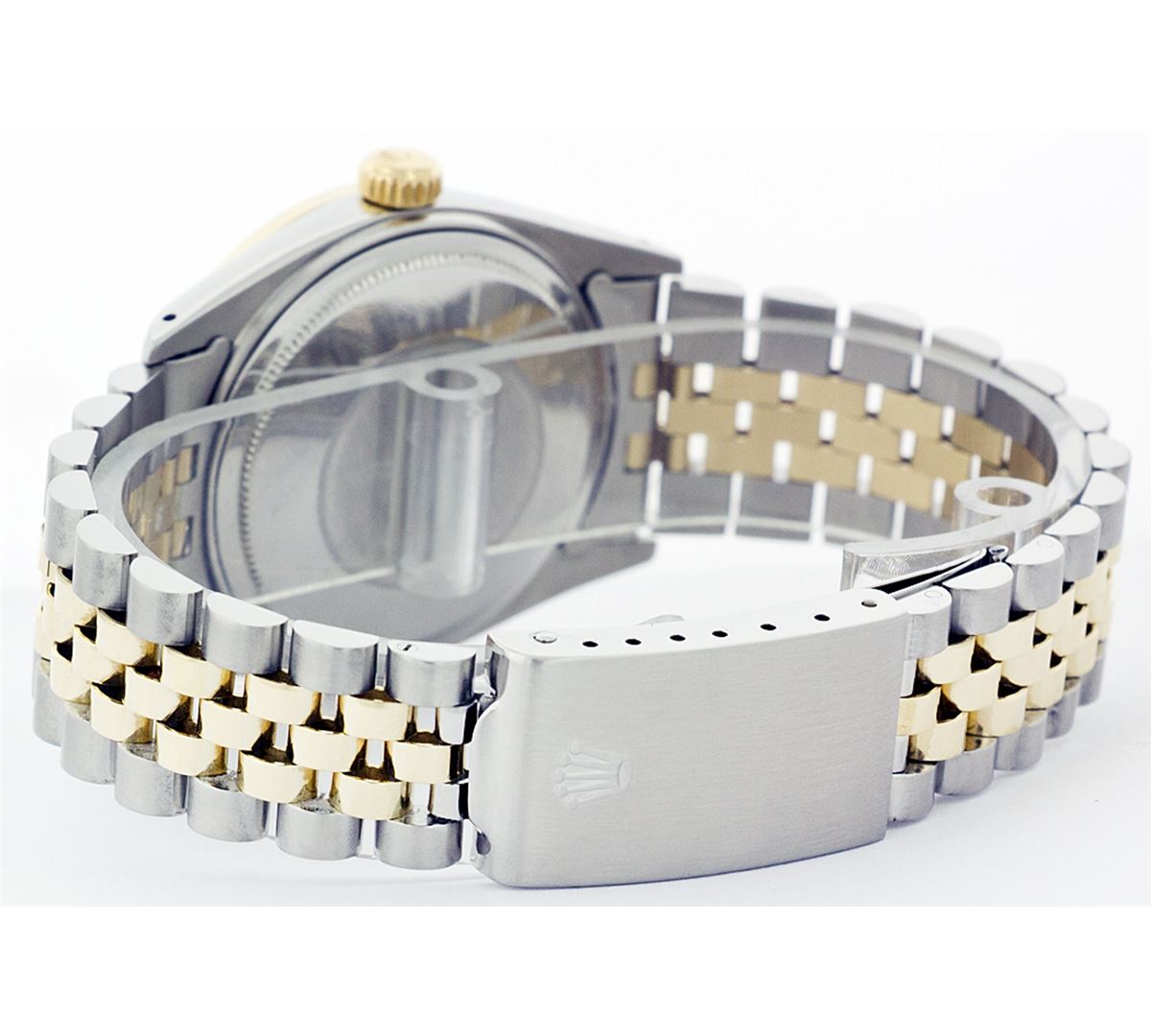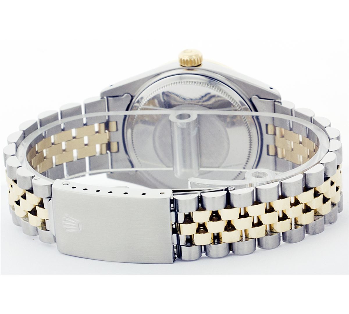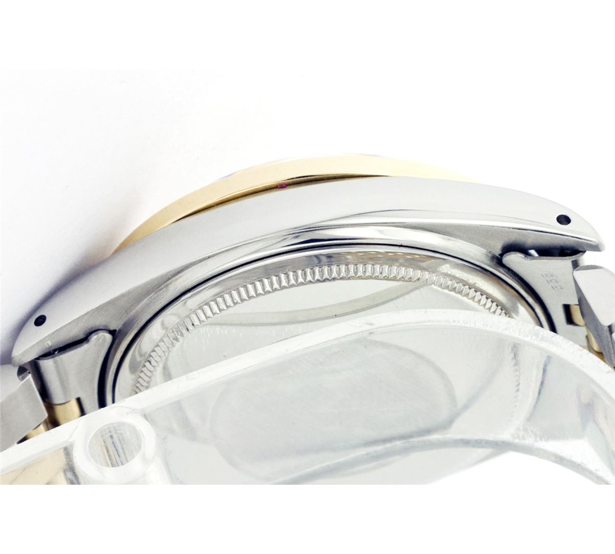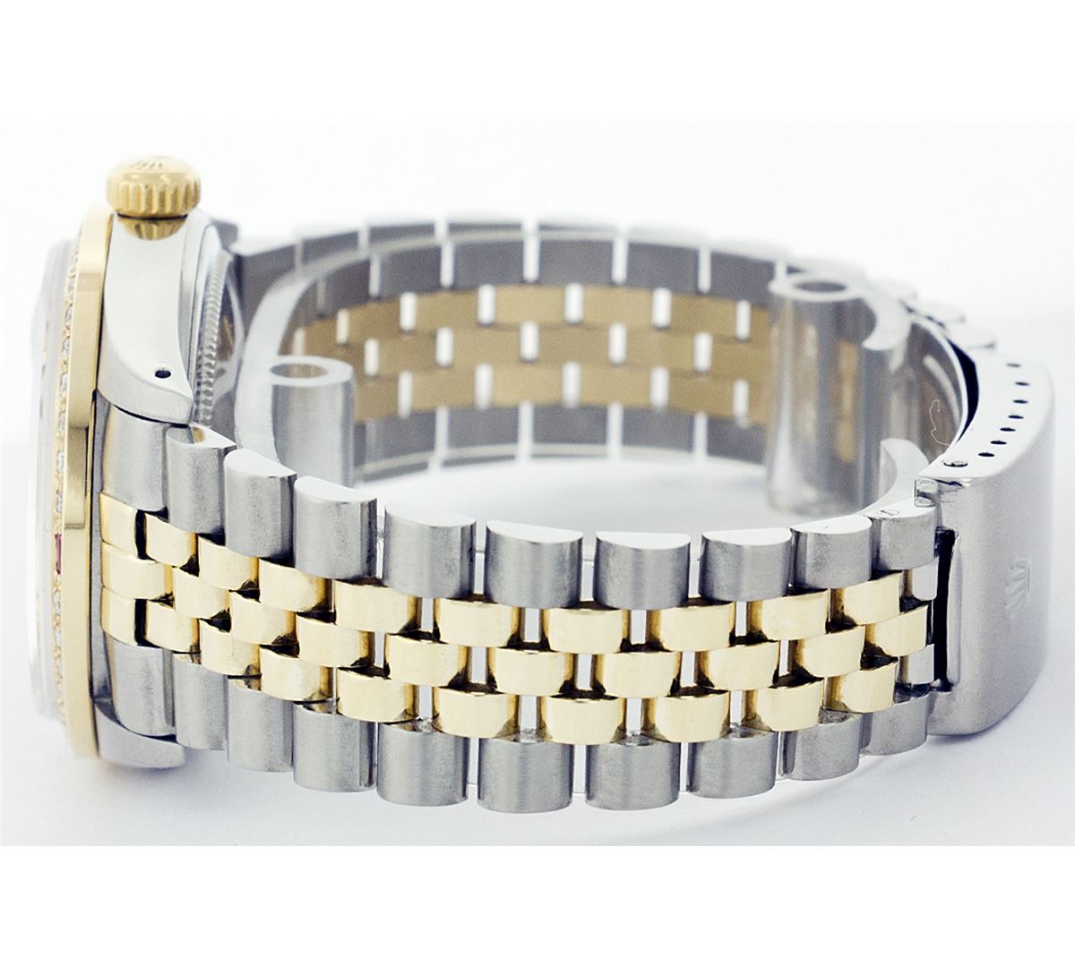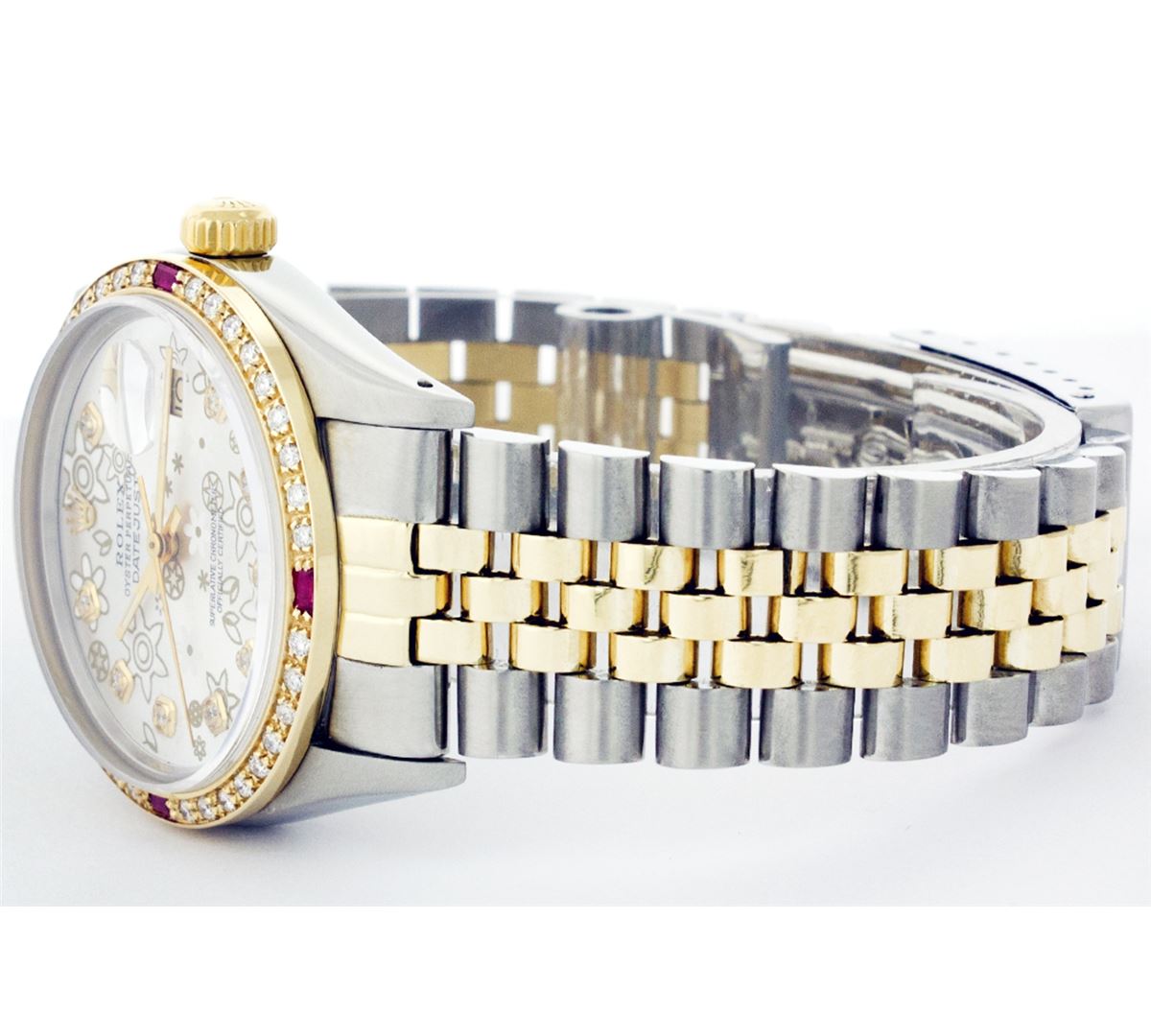 One Mens Two Tone Rolex Datejust Polished, Serviced & Electronically Tested, 14K Yellow Gold & Stainless Steel Case:36mm, 14K Yellow Gold Crown, Custom Bezel: 18K Yellow Gold Ruby Beadset Diamond Bezel, Diamond Count: 36 Diamonds + 4 Rubies Total Weight 1.00 Carat, Clarity: Si-VS, Color: G to H. Custom Crystal: Synthetic Sapphire Cyclops Lens. Movement: Automatic Winding Movement Caliber 3035. Custom Dial: Silver Floral Dial Set With Diamond Hour Markers, 10 Diamond in Dial G To H In Color, SI-VS Clarity. Date Window: 3 O'Clock Position Date Display, Quickset, Model: 16013 Condition: G-6 Extra Fine. Bracelet: Two Tone 14K Yellow Gold & Stainless Steel Jubilee. Bright Polish. 6.5 Inch Length, Adjustable. Standard Clasp, With Rolex Logo.
