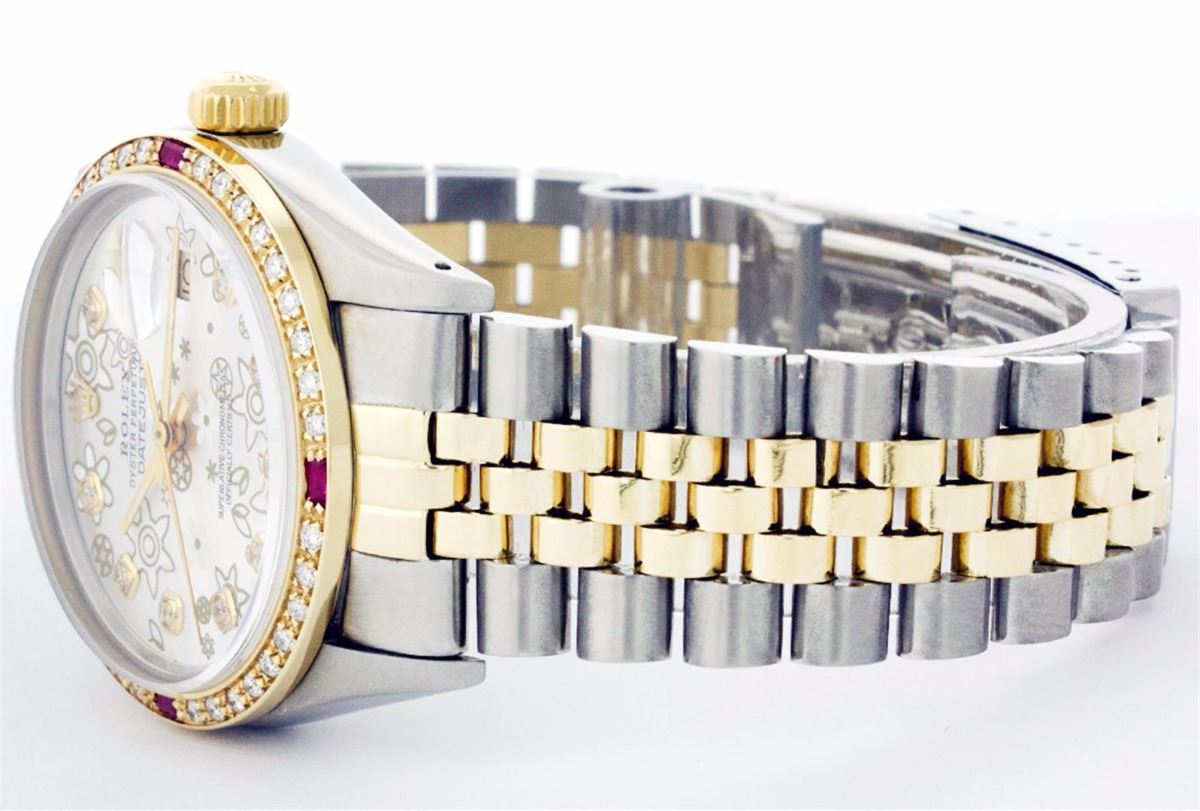 One Mens Two Tone Rolex Datejust Polished, Serviced & Electronically Tested, 14K Yellow Gold & Stainless Steel Case:36mm, 14K Yellow Gold Crown, Custom Bezel: 18K Yellow Gold Ruby Beadset Diamond Bezel, Diamond Count: 36 Diamonds + 4 Rubies Total Weight 1.00 Carat, Clarity: Si-VS, Color: G to H. Custom Crystal: Synthetic Sapphire Cyclops Lens. Movement: Automatic Winding Movement Caliber 3035. Custom Dial: Silver Floral Dial Set With Diamond Hour Markers, 10 Diamond in Dial G To H In Color, SI-VS Clarity. Date Window: 3 O'Clock Position Date Display, Quickset, Model: 16013 Condition: G-6 Extra Fine. Bracelet: Two Tone 14K Yellow Gold & Stainless Steel Jubilee. Bright Polish. 6.5 Inch Length, Adjustable. Standard Clasp, With Rolex Logo.