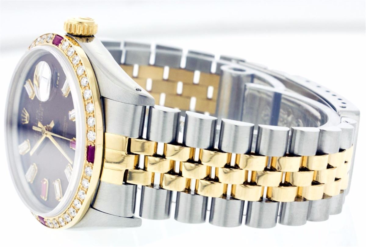 One Mens Two Tone Rolex Datejust Polished, Serviced & Electronically Tested, 14K Yellow Gold & Stainless Steel Case:36mm, 14K Yellow Gold Crown, Custom Bezel: 18K Yellow Gold Ruby Beadset Diamond Bezel, Diamond + Gem Count: 38 Diamonds + 4 Rubies Total Weight 1.00 Carat, Clarity: Si-VS, Color: G to H. Custom Crystal: Synthetic Sapphire Cyclops Lens. Movement: Automatic Winding Movement Caliber 3035. Custom Dial: Chocolate Dial Set With Baguette Hour Markers, 8 Baguettes + 2 Ruby Baguettes in Dial, Dial Weight: .40 Carat G To H In Color, Clarity: SI-VS Date Window: 3 O'Clock Position Date Display, Quickset, Model: 16013 Condition: G-6 Extra Fine. Bracelet: Two Tone 14K Yellow Gold & Stainless Steel Jubilee. Bright Polish. 6.5 Inch Length, Adjustable. Standard Clasp, With Rolex Logo.