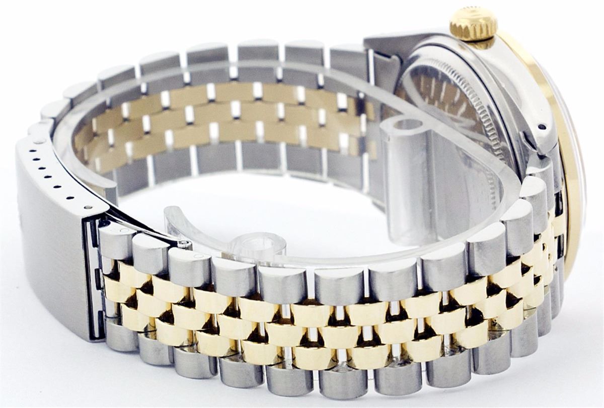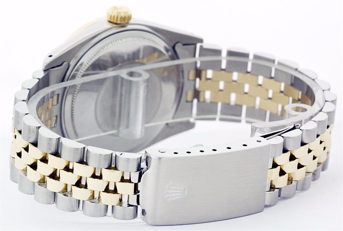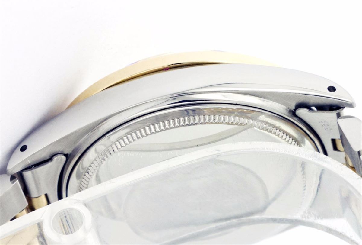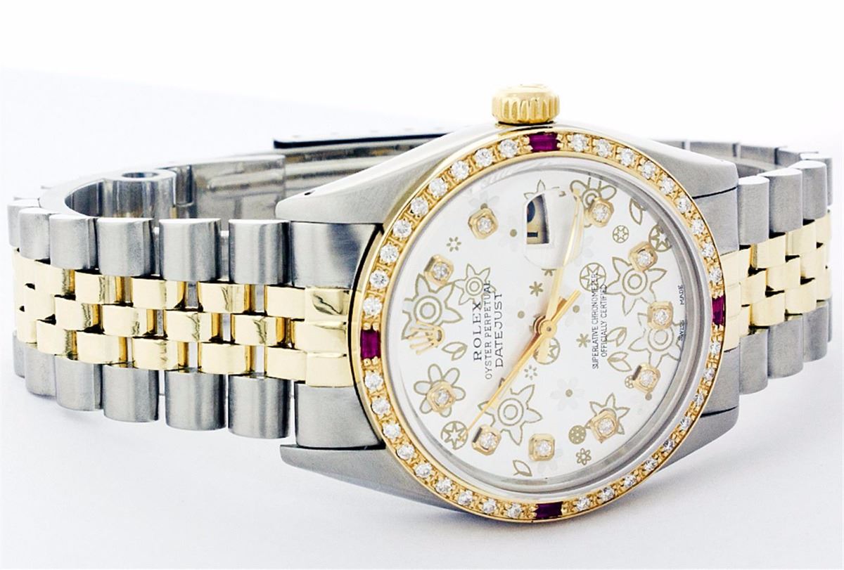 One Mens Two Tone Rolex Datejust Polished, Serviced & Electronically Tested, 14K Yellow Gold & Stainless Steel Case:36mm, 14K Yellow Gold Crown, Custom Bezel: 18K Yellow Gold Ruby Beadset Diamond Bezel, Diamond Count: 36 Diamonds + 4 Rubies Total Weight 1.00 Carat, Clarity: Si-VS, Color: G to H. Custom Crystal: Synthetic Sapphire Cyclops Lens. Movement: Automatic Winding Movement Caliber 3035. Custom Dial: Silver Floral Dial Set With Diamond Hour Markers, 10 Diamond in Dial G To H In Color, SI-VS Clarity. Date Window: 3 O'Clock Position Date Display, Quickset, Model: 16013 Condition: G-6 Extra Fine. Bracelet: Two Tone 14K Yellow Gold & Stainless Steel Jubilee. Bright Polish. 6.5 Inch Length, Adjustable. Standard Clasp, With Rolex Logo.