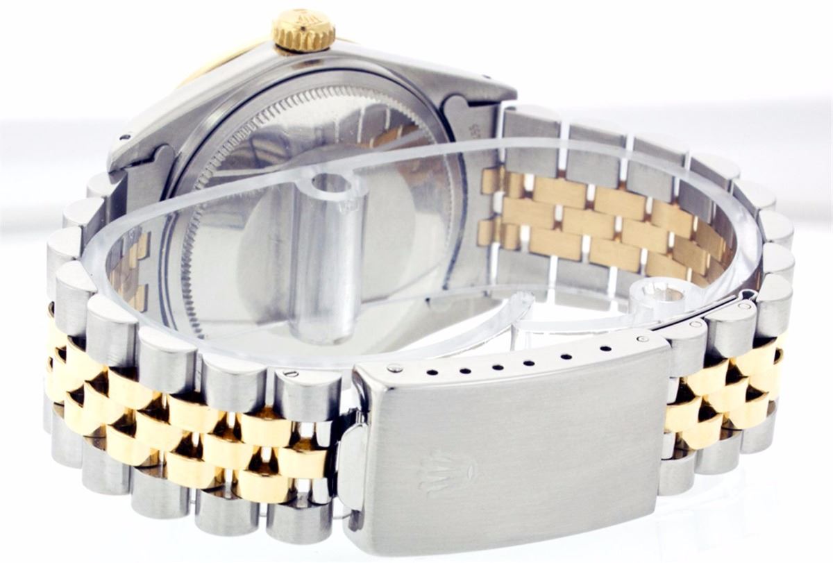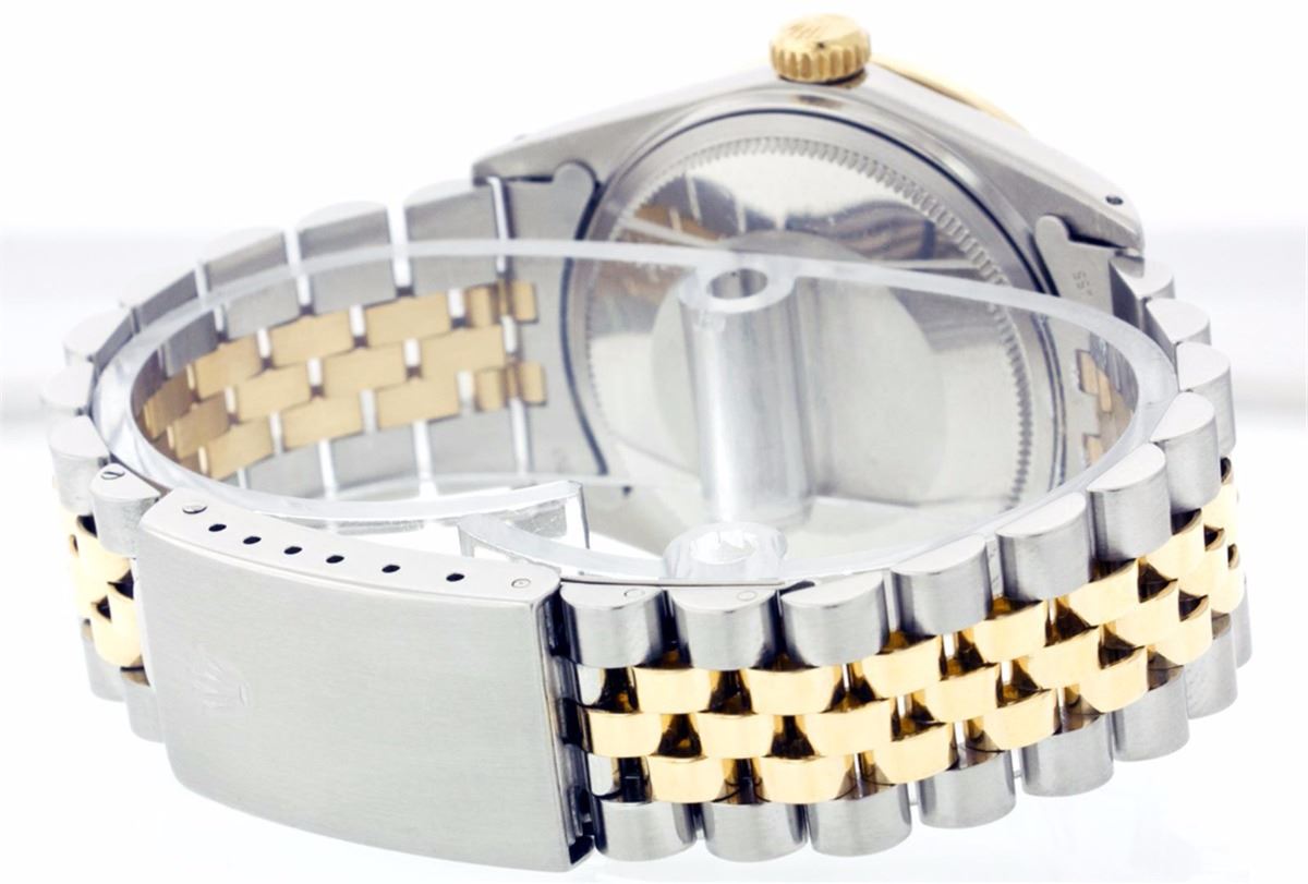 One Mens Two Tone Rolex Datejust Polished, Serviced & Electronically Tested, 14K Yellow Gold & Stainless Steel Case:36mm, 14K Yellow Gold Crown, Custom Bezel: 18K Yellow Gold Ruby Beadset Diamond Bezel, Diamond + Gem Count: 38 Diamonds + 4 Rubies Total Weight 1.00 Carat, Clarity: Si-VS, Color: G to H. Custom Crystal: Synthetic Sapphire Cyclops Lens. Movement: Automatic Winding Movement Caliber 3035. Custom Dial: Chocolate Dial Set With Baguette Hour Markers, 8 Baguettes + 2 Ruby Baguettes in Dial, Dial Weight: .40 Carat G To H In Color, Clarity: SI-VS Date Window: 3 O'Clock Position Date Display, Quickset, Model: 16013 Condition: G-6 Extra Fine. Bracelet: Two Tone 14K Yellow Gold & Stainless Steel Jubilee. Bright Polish. 6.5 Inch Length, Adjustable. Standard Clasp, With Rolex Logo.