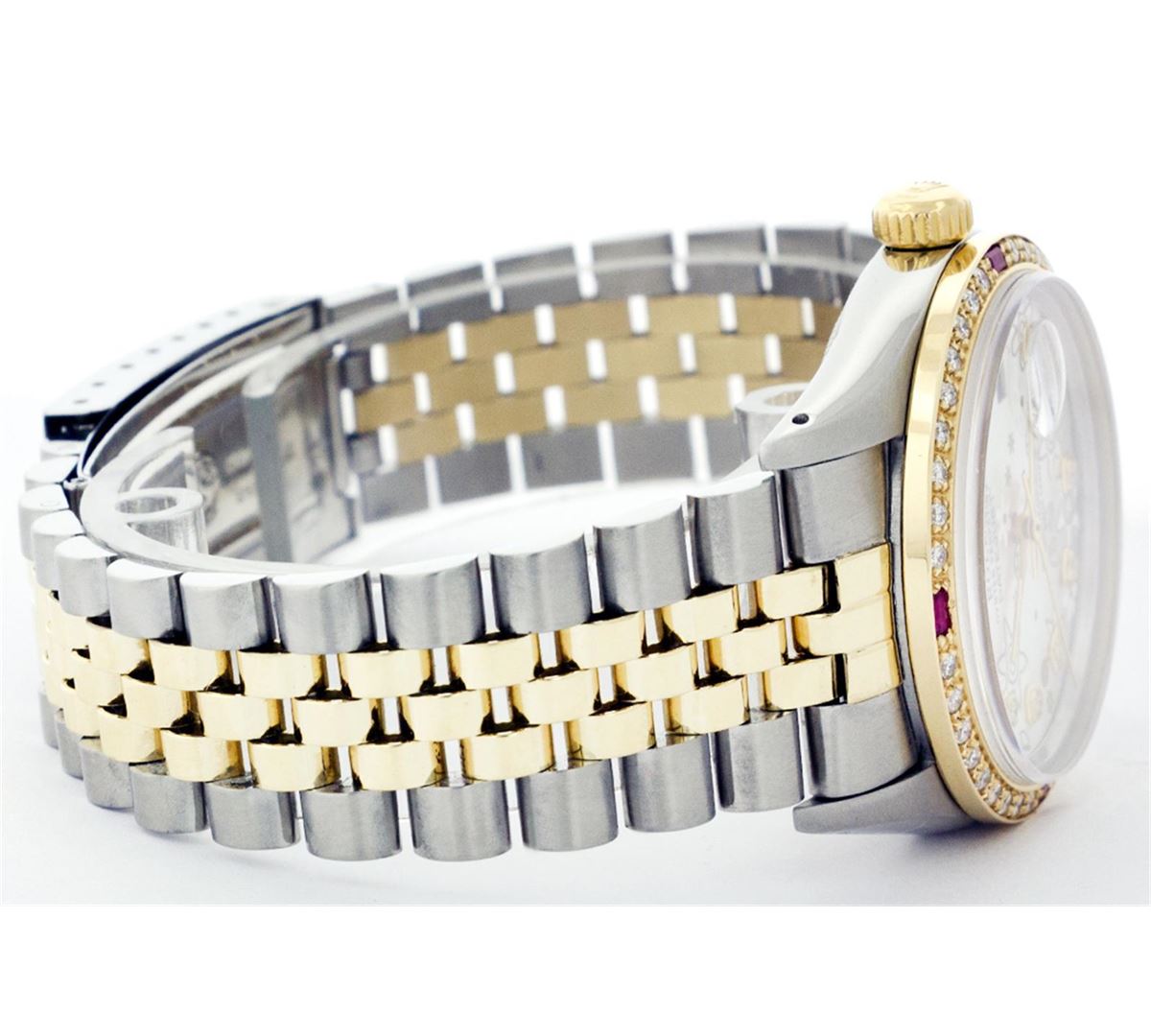 One Gents Two Tone Rolex Datejust Polished, Serviced & Electronically Tested, 14K Yellow Gold & Stainless Steel Case:36mm, 14K Yellow Gold Crown, Custom Bezel: 18K Yellow Gold Ruby Beadset Diamond Bezel, Diamond Count: 36 Diamonds + 4 Rubies Total Weight 1.00 Carat, Clarity: Si-VS, Color: G to H. Custom Crystal: Synthetic Sapphire Cyclops Lens. Movement: Automatic Winding Movement Caliber 3035. Custom Dial: Silver Floral Dial Set With Diamond Hour Markers, 10 Diamond in Dial G To H In Color, SI-VS Clarity. Date Window: 3 O'Clock Position Date Display, Quickset, Model: 16013 Condition: G-6 Extra Fine. Bracelet: Two Tone 14K Yellow Gold & Stainless Steel Jubilee. Bright Polish. 6.5 Inch Length, Adjustable. Standard Clasp, With Rolex Logo.