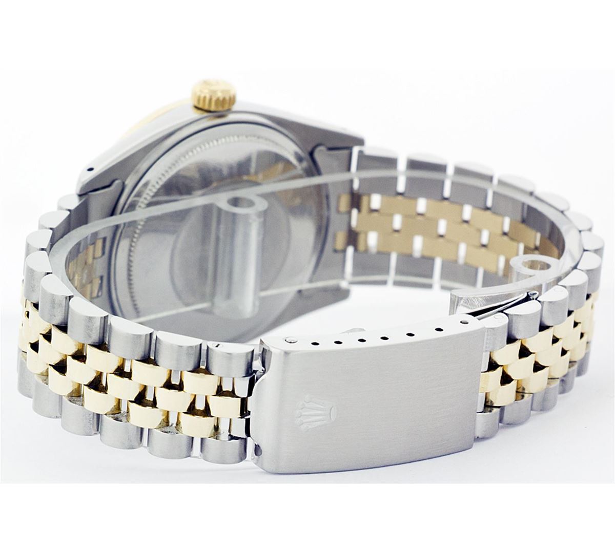 One Mens Two Tone Rolex Datejust Polished, Serviced & Electronically Tested, 14K Yellow Gold & Stainless Steel Case:36mm, 14K Yellow Gold Crown, Custom Bezel: 18K Yellow Gold Ruby Beadset Diamond Bezel, Diamond Count: 36 Diamonds + 4 Rubies Total Weight 1.00 Carat, Clarity: Si-VS, Color: G to H. Custom Crystal: Synthetic Sapphire Cyclops Lens. Movement: Automatic Winding Movement Caliber 3035. Custom Dial: Silver Floral Dial Set With Diamond Hour Markers, 10 Diamond in Dial G To H In Color, SI-VS Clarity. Date Window: 3 O'Clock Position Date Display, Quickset, Model: 16013 Condition: G-6 Extra Fine. Bracelet: Two Tone 14K Yellow Gold & Stainless Steel Jubilee. Bright Polish. 6.5 Inch Length, Adjustable. Standard Clasp, With Rolex Logo.