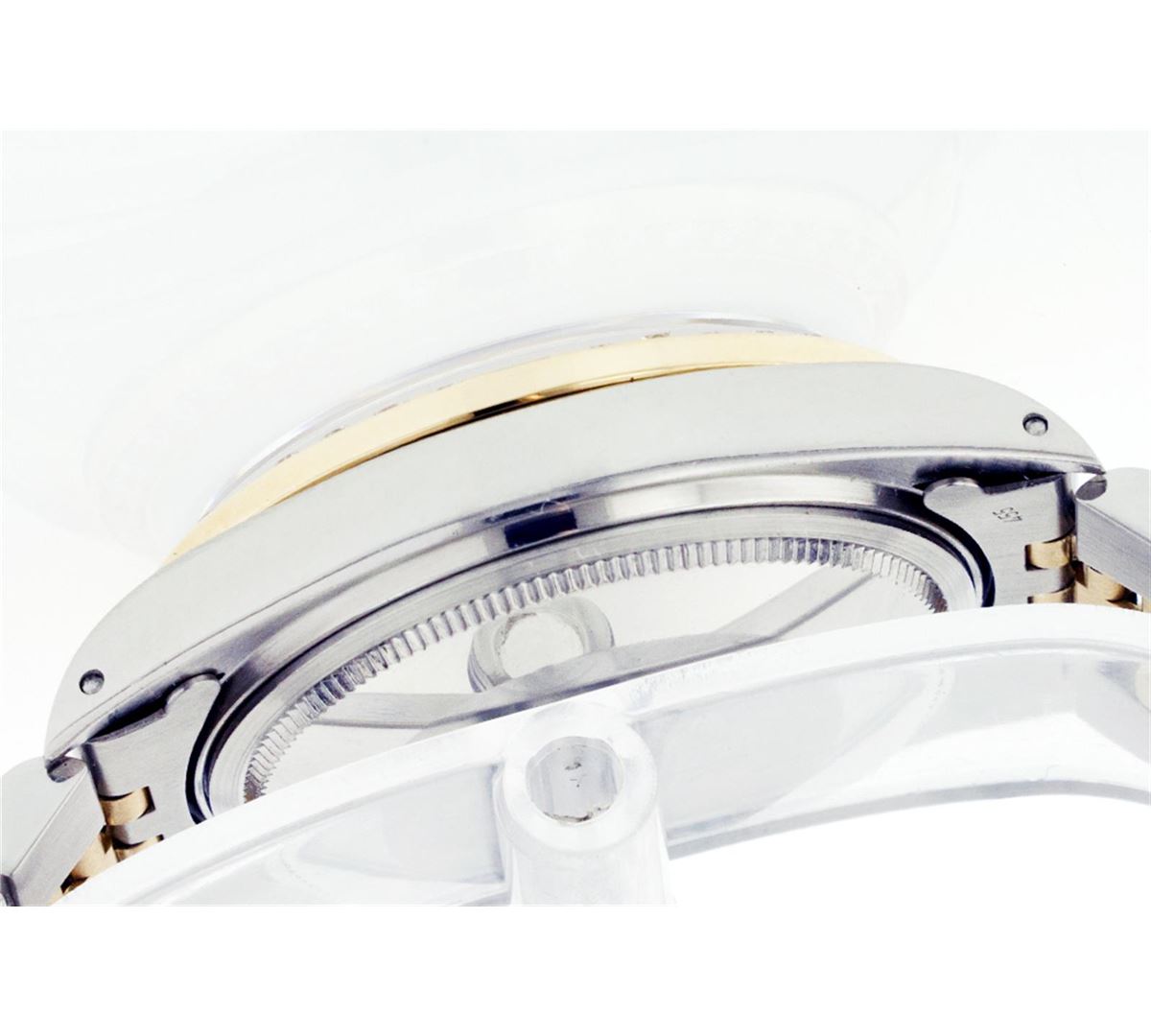 One Mens Two Tone Rolex Datejust Polished, Serviced & Electronically Tested, 14K Yellow Gold & Stainless Steel Case:36mm, 14K Yellow Gold Crown, Custom Bezel: 18K Yellow Gold Ruby Beadset Diamond Bezel, Diamond + Gem Count: 38 Diamonds + 4 Rubies Total Weight 1.00 Carat, Clarity: Si-VS, Color: G to H. Custom Crystal: Synthetic Sapphire Cyclops Lens. Movement: Automatic Winding Movement Caliber 3035. Custom Dial: Chocolate Dial Set With Baguette Hour Markers, 8 Baguettes + 2 Ruby Baguettes in Dial, Dial Weight: .40 Carat G To H In Color, Clarity: SI-VS Date Window: 3 O'Clock Position Date Display, Quickset, Model: 16013 Condition: G-6 Extra Fine. Bracelet: Two Tone 14K Yellow Gold & Stainless Steel Jubilee. Bright Polish. 6.5 Inch Length, Adjustable. Standard Clasp, With Rolex Logo.