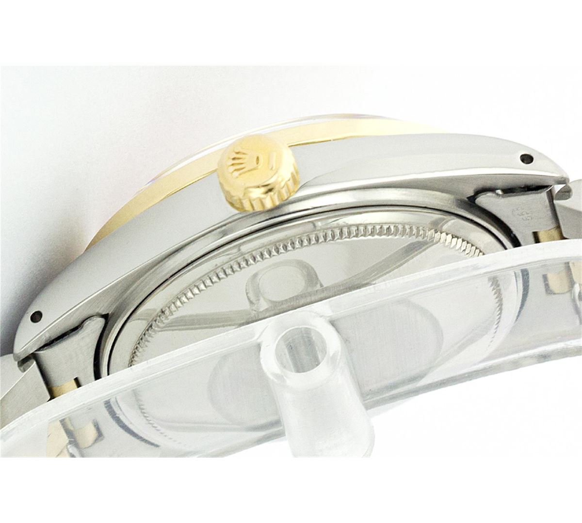 One Mens Two Tone Rolex Datejust Polished, Serviced & Electronically Tested, 14K Yellow Gold & Stainless Steel Case:36mm, 14K Yellow Gold Crown, Custom Bezel: 18K Yellow Gold Ruby Beadset Diamond Bezel, Diamond Count: 36 Diamonds + 4 Rubies Total Weight 1.00 Carat, Clarity: Si-VS, Color: G to H. Custom Crystal: Synthetic Sapphire Cyclops Lens. Movement: Automatic Winding Movement Caliber 3035. Custom Dial: Salmon Dial Set With Diamond Hour Markers, 10 Diamond in Dial G To H In Color, SI-VS Clarity. Date Window: 3 O'Clock Position Date Display, Quickset, Model: 16013 Condition: G-6 Extra Fine. Bracelet: Two Tone 14K Yellow Gold & Stainless Steel Jubilee. Bright Polish. 6.5 Inch Length, Adjustable. Standard Clasp, With Rolex Logo.