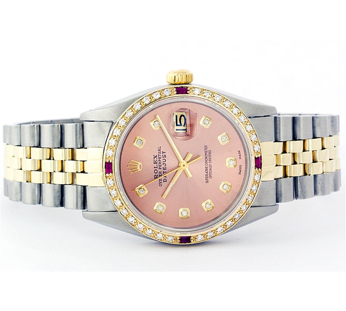 One Mens Two Tone Rolex Datejust Polished, Serviced & Electronically Tested, 14K Yellow Gold & Stainless Steel Case:36mm, 14K Yellow Gold Crown, Custom Bezel: 18K Yellow Gold Ruby Beadset Diamond Bezel, Diamond Count: 36 Diamonds + 4 Rubies Total Weight 1.00 Carat, Clarity: Si-VS, Color: G to H. Custom Crystal: Synthetic Sapphire Cyclops Lens. Movement: Automatic Winding Movement Caliber 3035. Custom Dial: Salmon Dial Set With Diamond Hour Markers, 10 Diamond in Dial G To H In Color, SI-VS Clarity. Date Window: 3 O'Clock Position Date Display, Quickset, Model: 16013 Condition: G-6 Extra Fine. Bracelet: Two Tone 14K Yellow Gold & Stainless Steel Jubilee. Bright Polish. 6.5 Inch Length, Adjustable. Standard Clasp, With Rolex Logo.