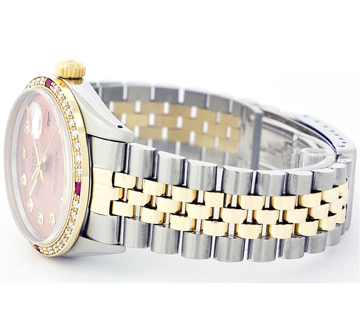 One Mens Two Tone Rolex Datejust Polished, Serviced & Electronically Tested, 14K Yellow Gold & Stainless Steel Case:36mm, 14K Yellow Gold Crown, Custom Bezel: 18K Yellow Gold Ruby Beadset Diamond Bezel, Diamond Count: 36 Diamonds + 4 Rubies Total Weight 1.00 Carat, Clarity: Si-VS, Color: G to H. Custom Crystal: Synthetic Sapphire Cyclops Lens. Movement: Automatic Winding Movement Caliber 3035. Custom Dial: Salmon Dial Set With Diamond Hour Markers, 10 Diamond in Dial G To H In Color, SI-VS Clarity. Date Window: 3 O'Clock Position Date Display, Quickset, Model: 16013 Condition: G-6 Extra Fine. Bracelet: Two Tone 14K Yellow Gold & Stainless Steel Jubilee. Bright Polish. 6.5 Inch Length, Adjustable. Standard Clasp, With Rolex Logo.