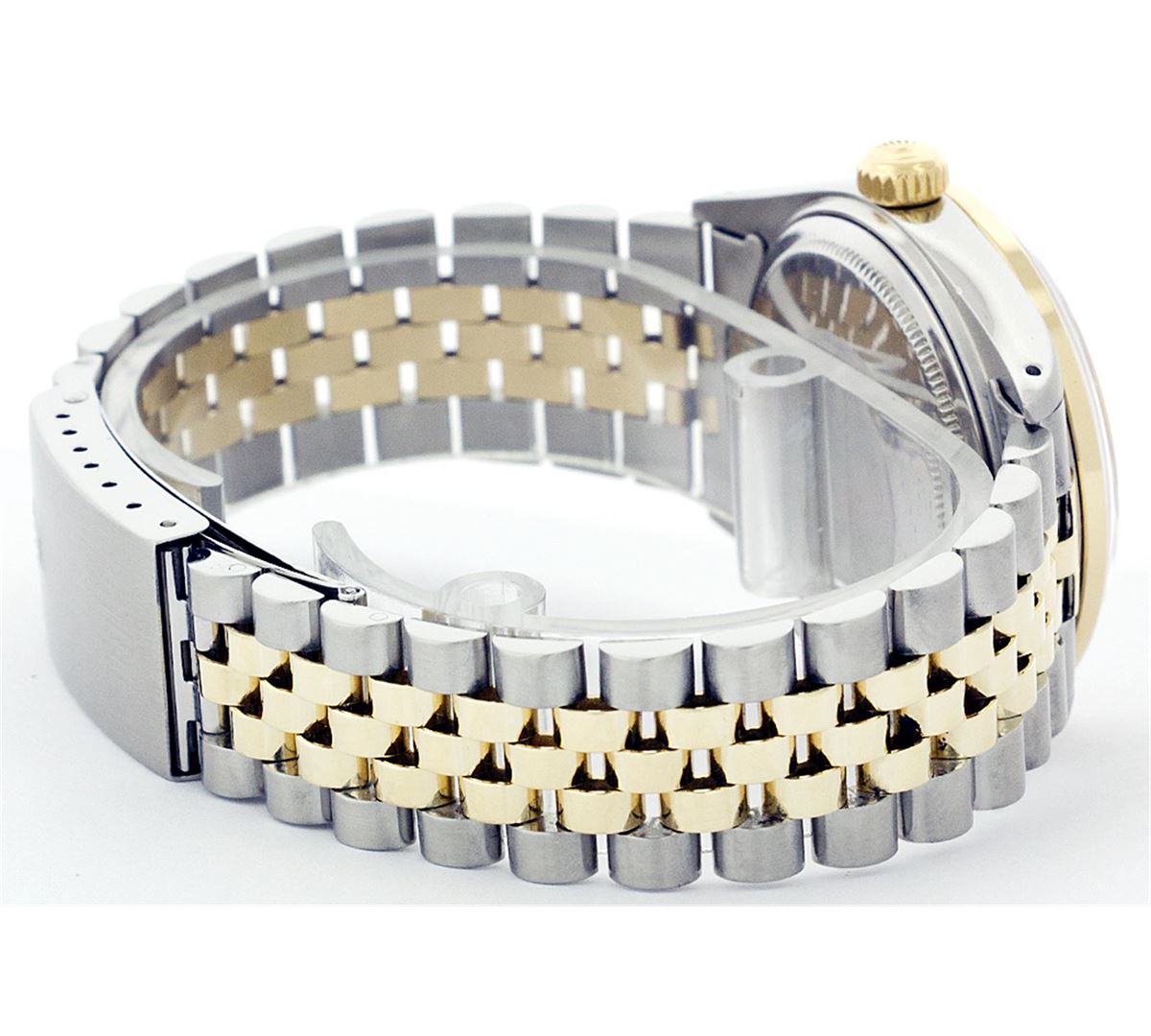 One Mens Two Tone Rolex Datejust Polished, Serviced & Electronically Tested, 14K Yellow Gold & Stainless Steel Case:36mm, 14K Yellow Gold Crown, Custom Bezel: 18K Yellow Gold Ruby Beadset Diamond Bezel, Diamond Count: 36 Diamonds + 4 Rubies Total Weight 1.00 Carat, Clarity: Si-VS, Color: G to H. Custom Crystal: Synthetic Sapphire Cyclops Lens. Movement: Automatic Winding Movement Caliber 3035. Custom Dial: Silver Floral Dial Set With Diamond Hour Markers, 10 Diamond in Dial G To H In Color, SI-VS Clarity. Date Window: 3 O'Clock Position Date Display, Quickset, Model: 16013 Condition: G-6 Extra Fine. Bracelet: Two Tone 14K Yellow Gold & Stainless Steel Jubilee. Bright Polish. 6.5 Inch Length, Adjustable. Standard Clasp, With Rolex Logo.