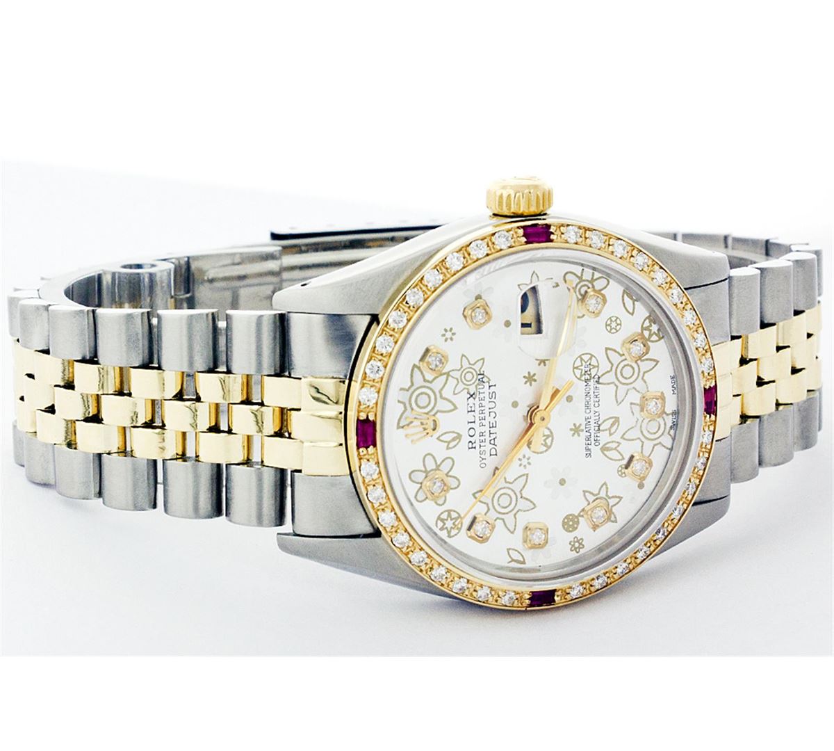 One Mens Two Tone Rolex Datejust Polished, Serviced & Electronically Tested, 14K Yellow Gold & Stainless Steel Case:36mm, 14K Yellow Gold Crown, Custom Bezel: 18K Yellow Gold Ruby Beadset Diamond Bezel, Diamond Count: 36 Diamonds + 4 Rubies Total Weight 1.00 Carat, Clarity: Si-VS, Color: G to H. Custom Crystal: Synthetic Sapphire Cyclops Lens. Movement: Automatic Winding Movement Caliber 3035. Custom Dial: Silver Floral Dial Set With Diamond Hour Markers, 10 Diamond in Dial G To H In Color, SI-VS Clarity. Date Window: 3 O'Clock Position Date Display, Quickset, Model: 16013 Condition: G-6 Extra Fine. Bracelet: Two Tone 14K Yellow Gold & Stainless Steel Jubilee. Bright Polish. 6.5 Inch Length, Adjustable. Standard Clasp, With Rolex Logo.