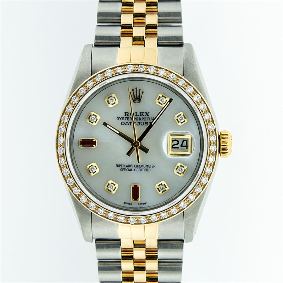One Mens Two Tone Rolex Datejust Polished, Serviced & Electronically Tested, 14K Yellow Gold & Stainless Steel Case:36mm, 14K Yellow Gold Crown, Custom Bezel: 18K Yellow Gold Beadset Diamond Bezel, Diamond Count: 44 Diamonds. Total Weight 1.00 Carat, Clarity: Si-VS, Color: G to H. Custom Crystal: Synthetic Sapphire Cyclops Lens. Movement: Automatic Winding Movement Caliber 3035. Custom Dial: Mother Of Pearl Diamond With Ruby Baguette, 8 Diamonds + 2 Ruby Baguettes in Dial, Dial Weight: .40 Carat G To H In Color, Clarity: SI-VS Date Window: 3 O'Clock Position Date Display, Quickset, Model: 16013 Condition: G-6 Extra Fine. Bracelet: Two Tone 14K Yellow Gold & Stainless Steel Jubilee. Bright Polish. 7.0 Inch Length, Adjustable. Standard Clasp, With Rolex Logo. Comes with 6 month warranty.