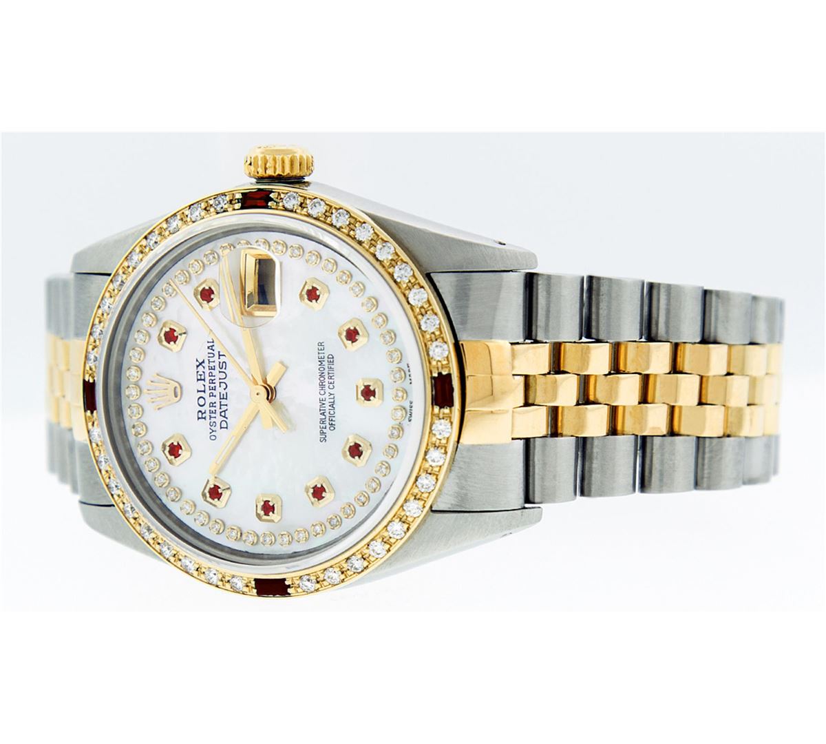 One Mens Two Tone Rolex Datejust Polished, Serviced & Electronically Tested, 14K Yellow Gold & Stainless Steel Case:36mm, 14K Yellow Gold Crown, Custom Bezel: 18K Yellow Gold Ruby Beadset Diamond Bezel, Diamond Count: 36 Diamonds + 4 Rubies Total Weight 1.00 Carat, Clarity: Si-VS, Color: G to H. Custom Crystal: Synthetic Sapphire Cyclops Lens. Movement: Automatic Winding Movement Caliber 3035. Custom Dial: Mother Of Pearl Ruby String Diamond Dial , Diamond + Gem Count: 10 Ruby + 48 Diamonds in Dial G To H In Color, SI-VS Clarity. Date Window: 3 O'Clock Position Date Display, Quickset, Model: 16013 Condition: G-6 Extra Fine. Bracelet: Two Tone 14K Yellow Gold & Stainless Steel Jubilee. Bright Polish. 7.0 Inch Length, Adjustable. Standard Clasp, With Rolex Logo. Comes with 6 month warranty.