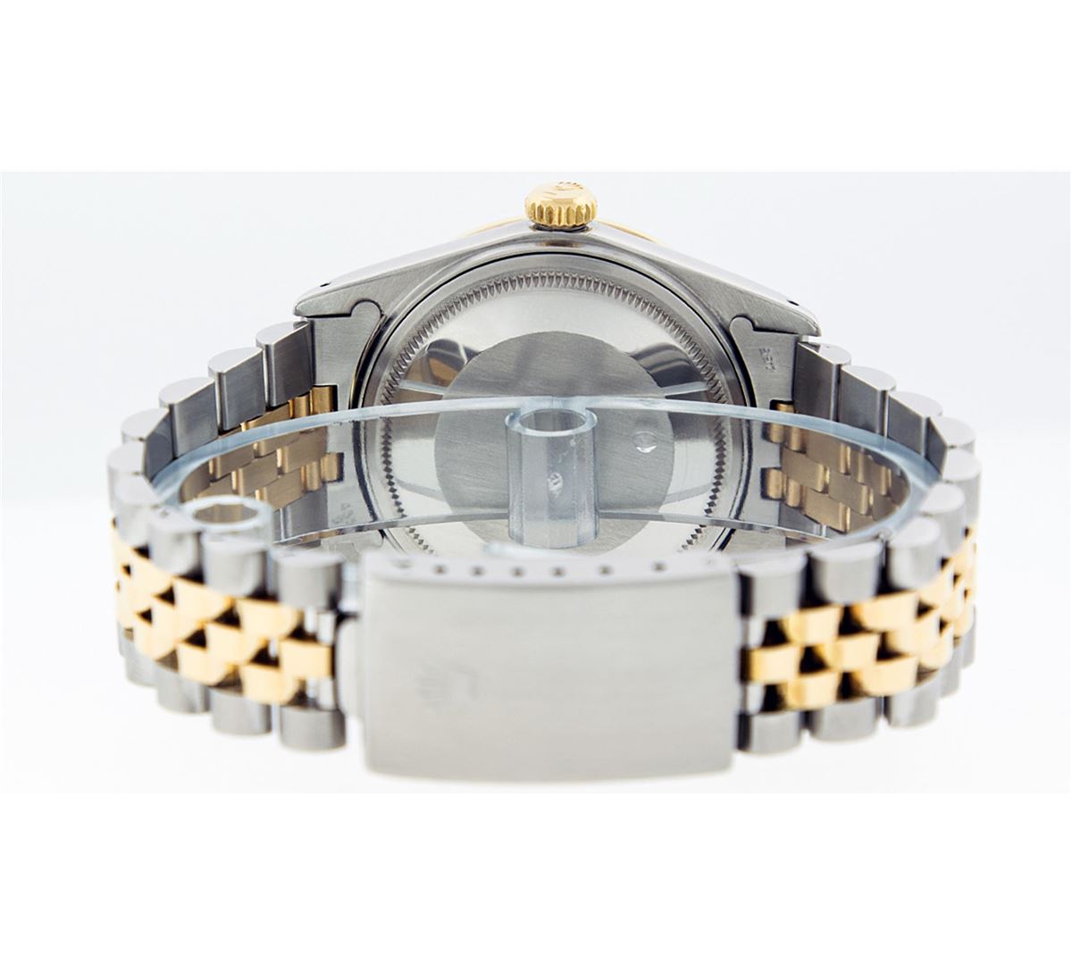 One Mens Two Tone Rolex Datejust Polished, Serviced & Electronically Tested, 14K Yellow Gold & Stainless Steel Case:36mm, 14K Yellow Gold Crown, Custom Bezel: 18K Yellow Gold Ruby Beadset Diamond Bezel, Diamond Count: 36 Diamonds + 4 Rubies Total Weight 1.00 Carat, Clarity: Si-VS, Color: G to H. Custom Crystal: Synthetic Sapphire Cyclops Lens. Movement: Automatic Winding Movement Caliber 3035. Custom Dial: Mother Of Pearl Ruby String Diamond Dial , Diamond + Gem Count: 10 Ruby + 48 Diamonds in Dial G To H In Color, SI-VS Clarity. Date Window: 3 O'Clock Position Date Display, Quickset, Model: 16013 Condition: G-6 Extra Fine. Bracelet: Two Tone 14K Yellow Gold & Stainless Steel Jubilee. Bright Polish. 7.0 Inch Length, Adjustable. Standard Clasp, With Rolex Logo. Comes with 6 month warranty.