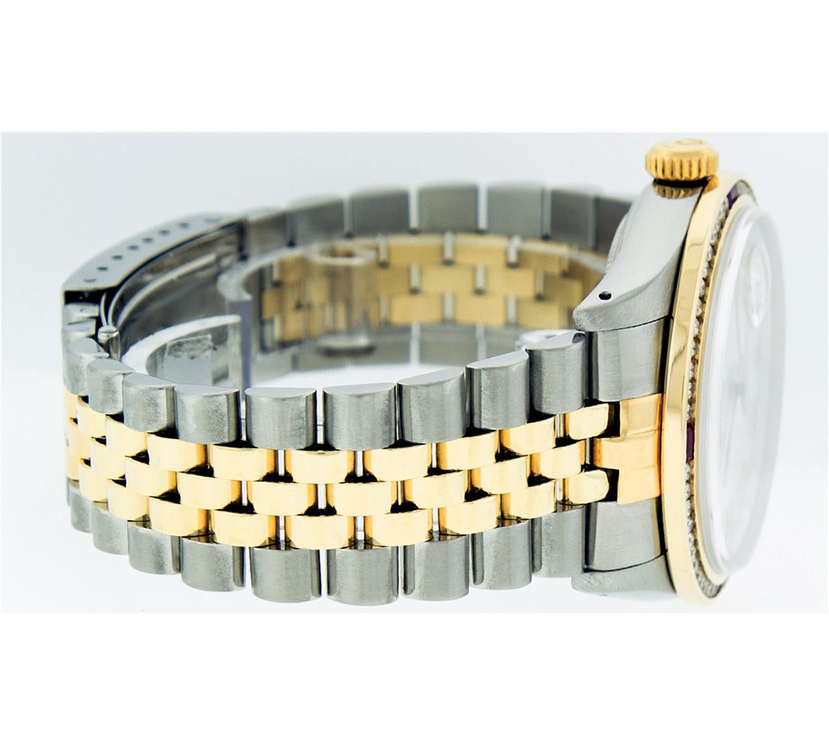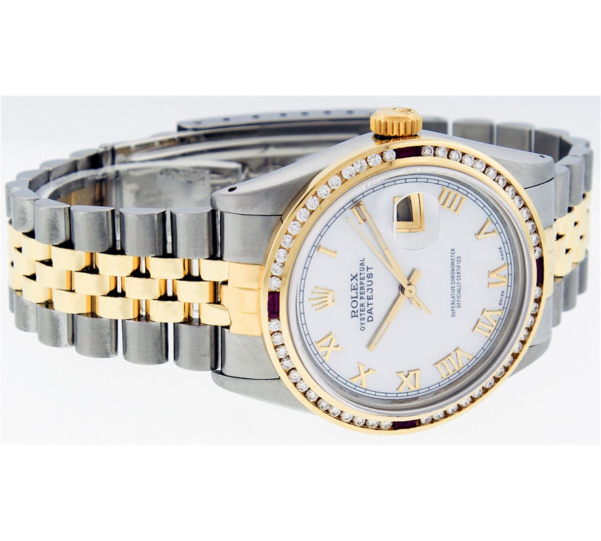 One Mens Two Tone Rolex Datejust Polished, Serviced & Electronically Tested, 14K Yellow Gold & Stainless Steel Case:36mm, 14K Yellow Gold Crown, Custom Bezel: 18K Yellow Gold Ruby Channel Set Diamond Bezel, Diamond Count: 52 Diamonds + 4 Rubies, Total Weight 1.30 Carat, Clarity: SI-VS, Color: G to H. Custom Crystal: Synthetic Sapphire Cyclops Lens. Movement: Automatic Winding Movement Caliber 3035. Custom Dial: Mother Of Pearl Roman Dial With Square Track. Date Window: 3 O'Clock Position Date Display, Quickset, Model: 16013 Condition: G-6 Extra Fine. Bracelet: Two Tone 14K Yellow Gold & Stainless Steel Jubilee. Bright Polish. 7.0 Inch Length, Adjustable. Standard Clasp, With Rolex Logo.