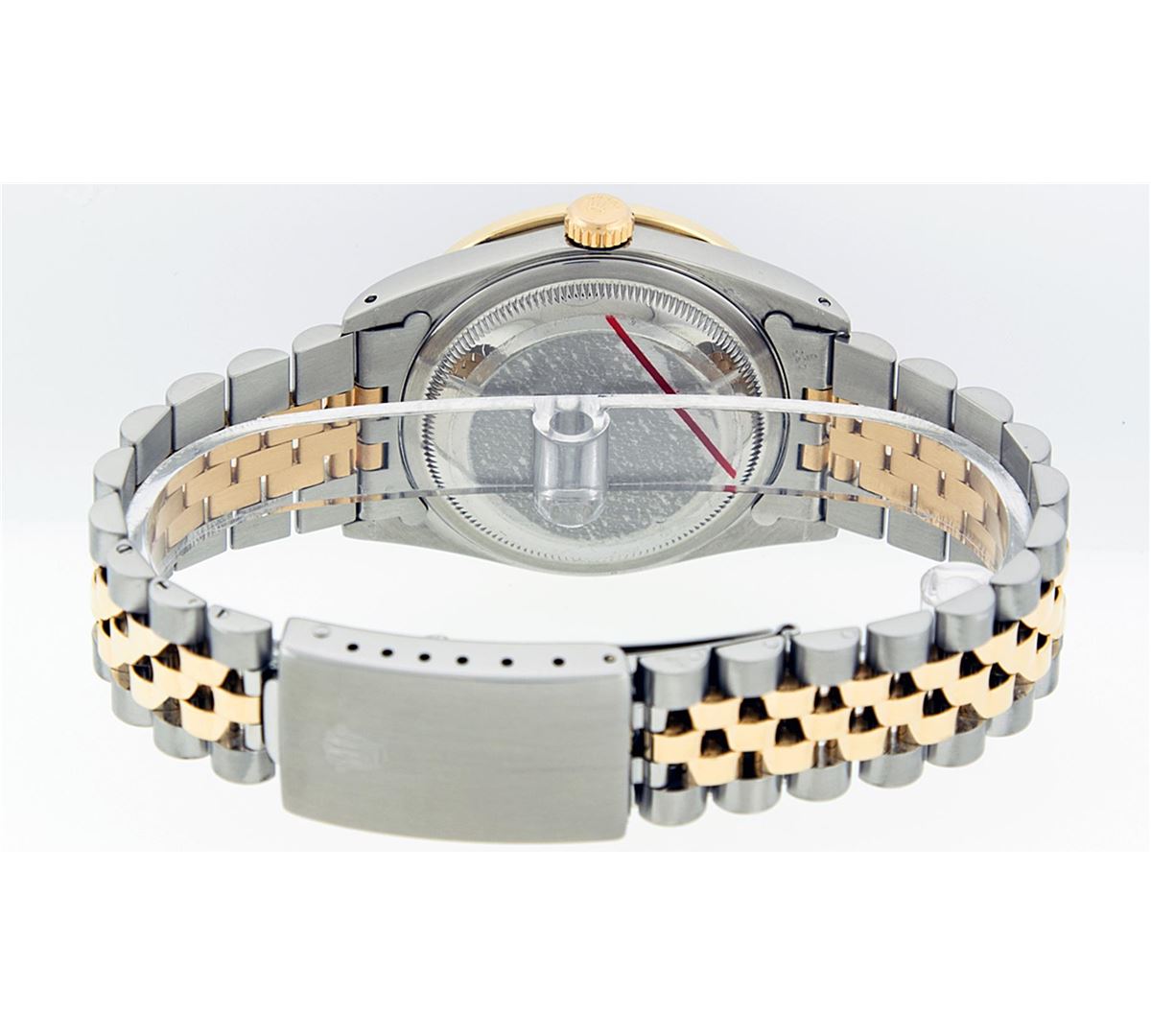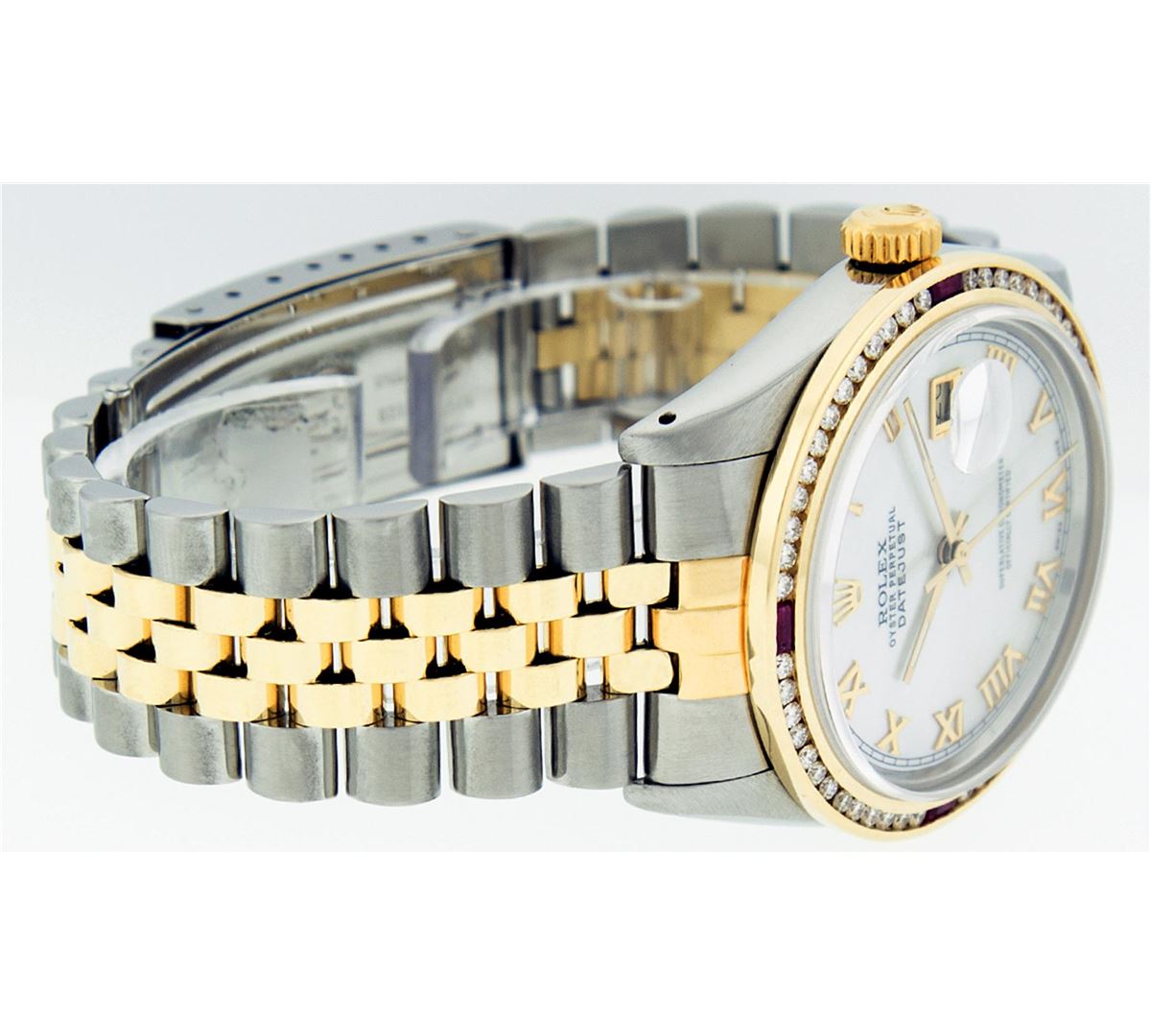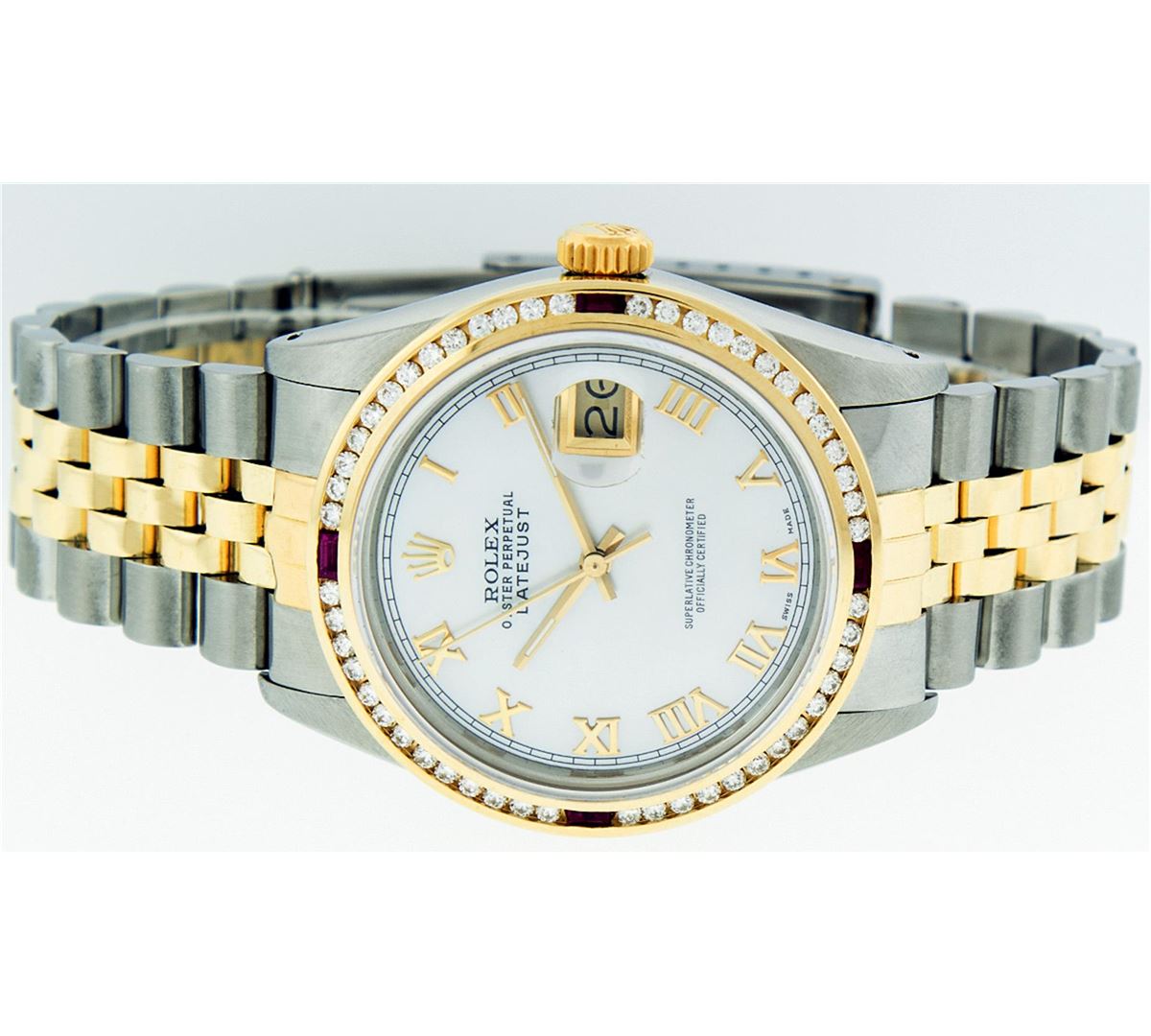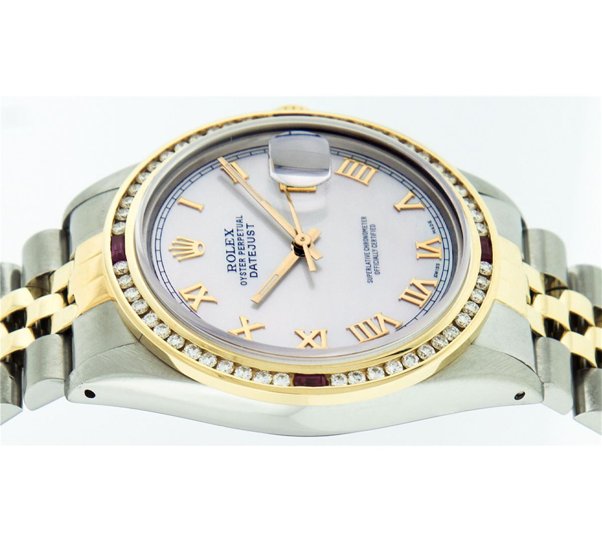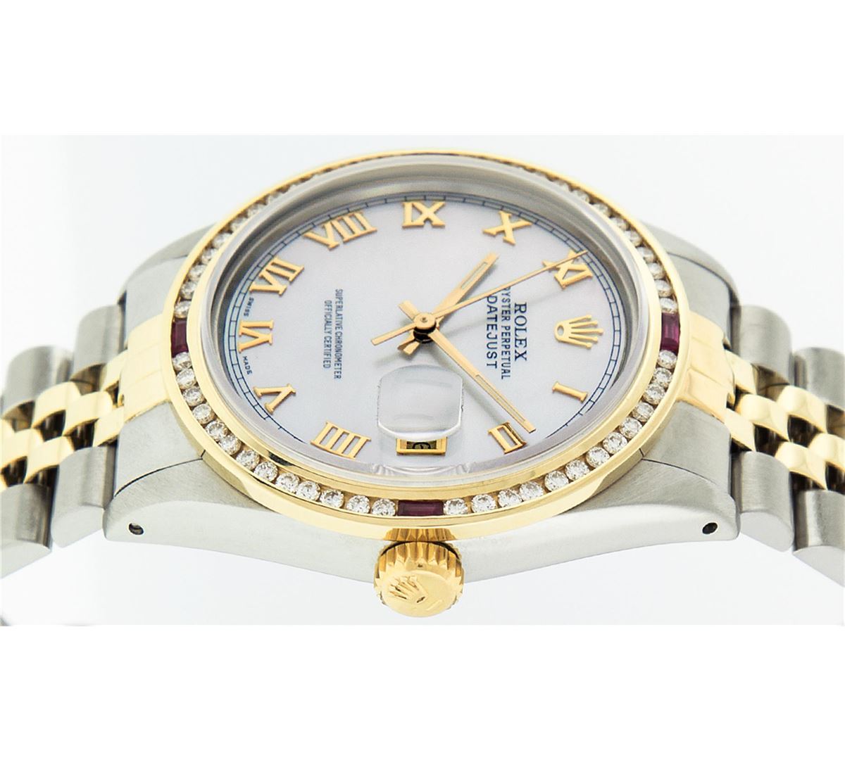 One Mens Two Tone Rolex Datejust Polished, Serviced & Electronically Tested, 14K Yellow Gold & Stainless Steel Case:36mm, 14K Yellow Gold Crown, Custom Bezel: 18K Yellow Gold Ruby Channel Set Diamond Bezel, Diamond Count: 52 Diamonds + 4 Rubies, Total Weight 1.30 Carat, Clarity: SI-VS, Color: G to H. Custom Crystal: Synthetic Sapphire Cyclops Lens. Movement: Automatic Winding Movement Caliber 3035. Custom Dial: Mother Of Pearl Roman Dial With Square Track. Date Window: 3 O'Clock Position Date Display, Quickset, Model: 16013 Condition: G-6 Extra Fine. Bracelet: Two Tone 14K Yellow Gold & Stainless Steel Jubilee. Bright Polish. 7.0 Inch Length, Adjustable. Standard Clasp, With Rolex Logo.