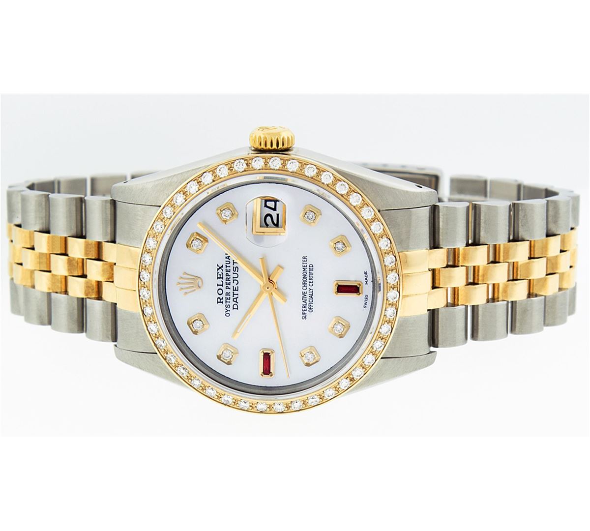 One Mens Two Tone Rolex Datejust Polished, Serviced & Electronically Tested, 14K Yellow Gold & Stainless Steel Case:36mm, 14K Yellow Gold Crown, Custom Bezel: 18K Yellow Gold Beadset Diamond Bezel, Diamond Count: 44 Diamonds. Total Weight 1.00 Carat, Clarity: Si-VS, Color: G to H. Custom Crystal: Synthetic Sapphire Cyclops Lens. Movement: Automatic Winding Movement Caliber 3035. Custom Dial: Mother Of Pearl Diamond With Ruby Baguette, 8 Diamonds + 2 Ruby Baguettes in Dial, Dial Weight: .40 Carat G To H In Color, Clarity: SI-VS Date Window: 3 O'Clock Position Date Display, Quickset, Model: 16013 Condition: G-6 Extra Fine. Bracelet: Two Tone 14K Yellow Gold & Stainless Steel Jubilee. Bright Polish. 7.0 Inch Length, Adjustable. Standard Clasp, With Rolex Logo. Comes with 6 month warranty.
