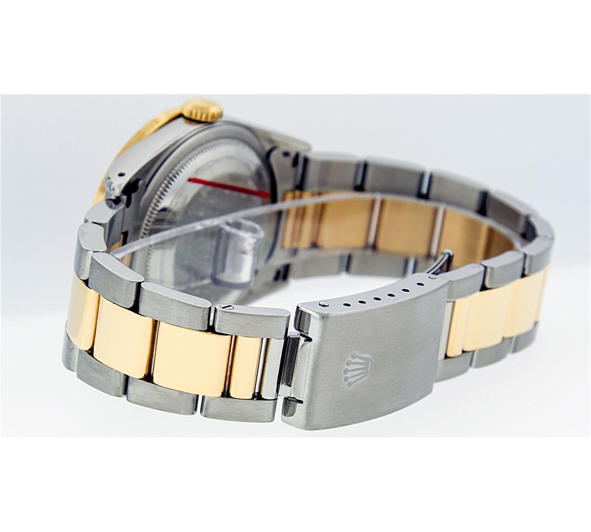 One Gents 18K Yellow Gold Two Tone Rolex Datejust Polished, Serviced & Electronically Tested, 18K Yellow Gold & Stainless Steel Case:36mm, Diamond Lugs On Case, Diamond Count: 16 Diamonds On Lugs, Color: G To H, Clarity: SI-VS. 18K Yellow Gold Crown, Custom Bezel: 18K Yellow Gold Ruby Beadset Diamond Bezel, Diamond Count: 36 Diamonds + 4 Rubies. Total Weight 1.00 Carat, Clarity: Si-VS, Color: G to H. Custom Crystal: Synthetic Sapphire Cyclops Lens. Movement: Automatic Winding Movement Caliber 3135. Custom Dial: Red Vignette String Diamond Dial VVS, Diamond Count: 58 Diamonds In Dial, Color: G To H, Clarity: VVS, Date Window: 3 O'Clock Position Date Display, Quickset, Model: 16233 Condition: G-6 Extra Fine The Watch Is In Very Good Condition Free Of All Scratches And Dents. Bracelet: Two Tone 18K Yellow Gold & Stainless Steel Oyster Band. Bright Polish. 7.0 Inch Length, Adjustable. Standard Clasp, With Rolex Logo. Comes with 6 month warranty.