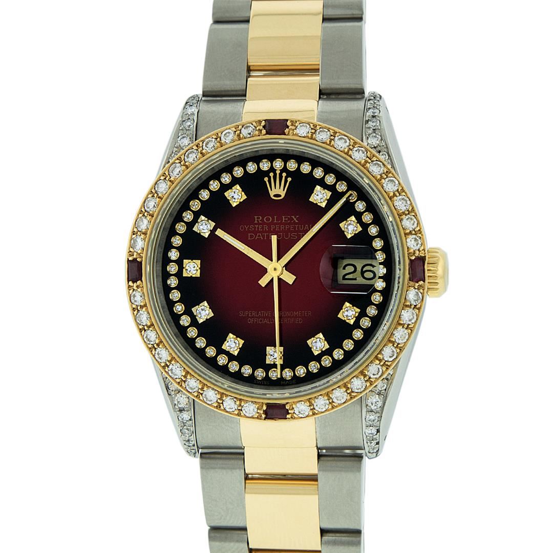 One Gents 18K Yellow Gold Two Tone Rolex Datejust Polished, Serviced & Electronically Tested, 18K Yellow Gold & Stainless Steel Case:36mm, Diamond Lugs On Case, Diamond Count: 16 Diamonds On Lugs, Color: G To H, Clarity: SI-VS. 18K Yellow Gold Crown, Custom Bezel: 18K Yellow Gold Ruby Beadset Diamond Bezel, Diamond Count: 36 Diamonds + 4 Rubies. Total Weight 1.00 Carat, Clarity: Si-VS, Color: G to H. Custom Crystal: Synthetic Sapphire Cyclops Lens. Movement: Automatic Winding Movement Caliber 3135. Custom Dial: Red Vignette String Diamond Dial VVS, Diamond Count: 58 Diamonds In Dial, Color: G To H, Clarity: VVS, Date Window: 3 O'Clock Position Date Display, Quickset, Model: 16233 Condition: G-6 Extra Fine The Watch Is In Very Good Condition Free Of All Scratches And Dents. Bracelet: Two Tone 18K Yellow Gold & Stainless Steel Oyster Band. Bright Polish. 7.0 Inch Length, Adjustable. Standard Clasp, With Rolex Logo. Comes with 6 month warranty.